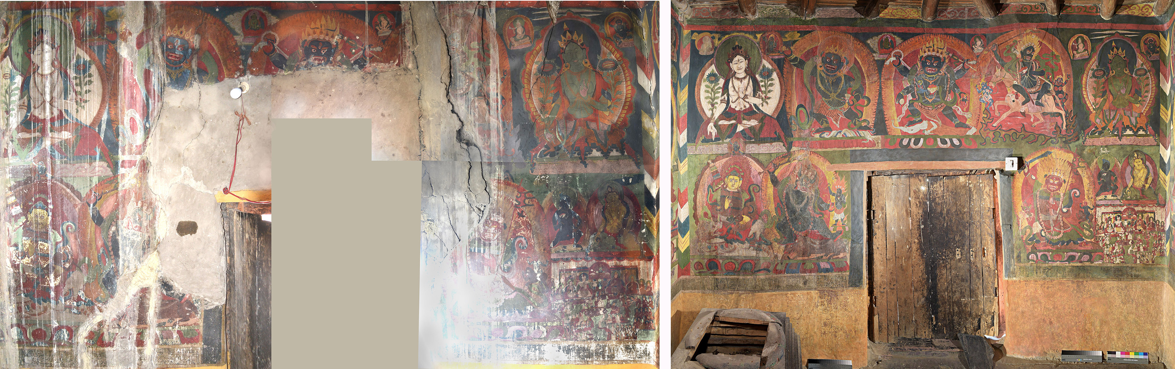 Dvojice fotografií dokumentuje proces obnovy prostor kláštera - vchodové stěny svatyně lhačung.