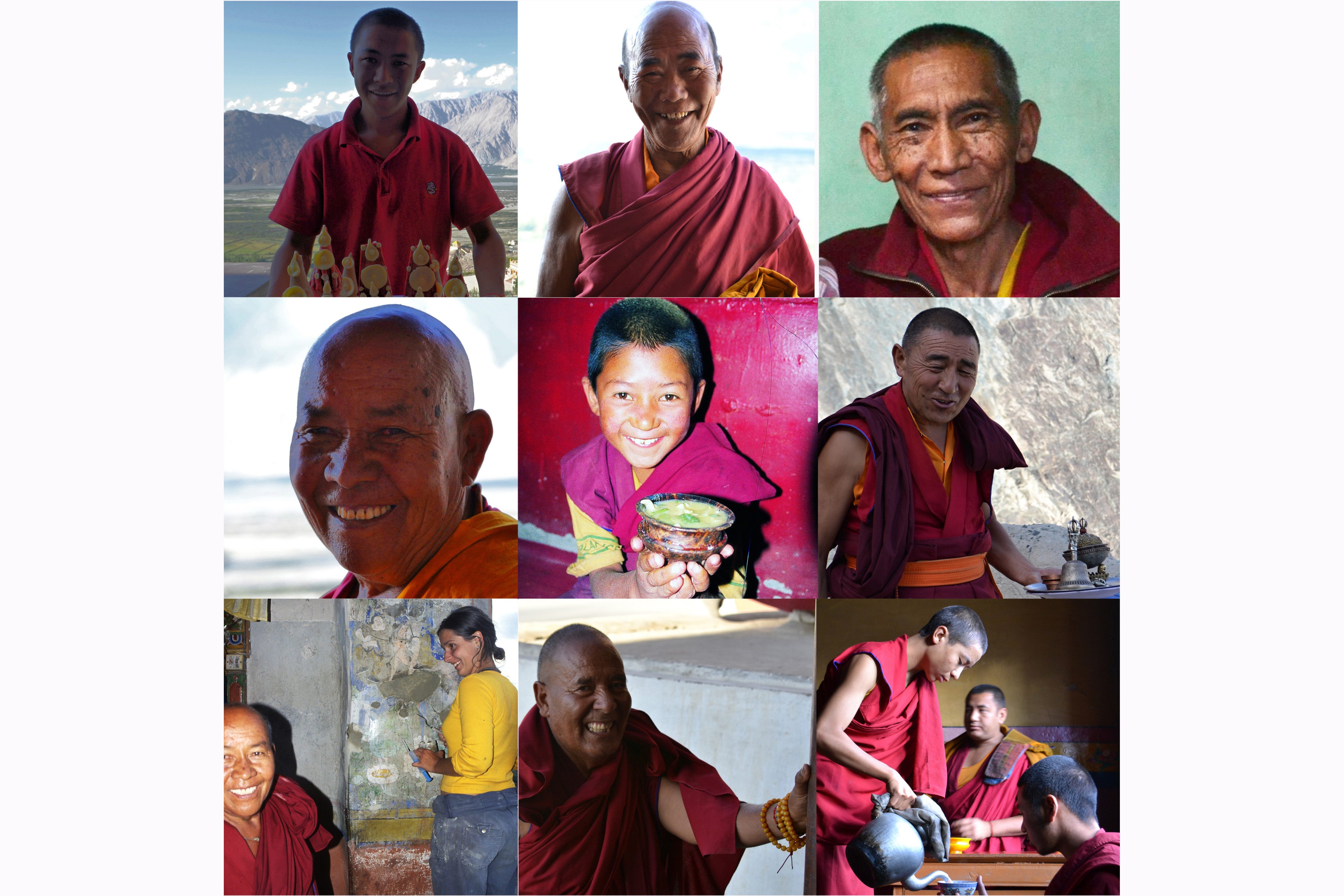 Novic Jonten k nám šel do učení coby průvodce turistů v r. 2012-15// gelong L.Sonam// ctihodný Tendzin (opat 2004 - 2005)// Lobsang Thabkas (opat 2006-2007)// žáček s polévkou thugpa a gestem dávání (1999)// gelong Punčhok–obřadník a rádce našich restaurátorek 2014-15// L.Thabkas se raduje z šikovnosti naší Dominiky(2006)// Norbu, zbožný a šikovný tesař// I Vám Lobsang Dečen naleje slaného čaje - pojeďte s námi do kláštera Diskit!