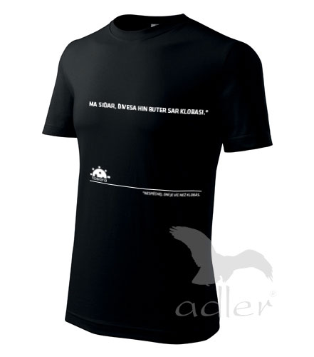 Nespěchej, dní je víc než klobás/ Ma siďar, ďivesa hin buter sar klobasi. Barva černá s bílým nápisem. A vaše jméno na tabuli jedničkářů navrch.