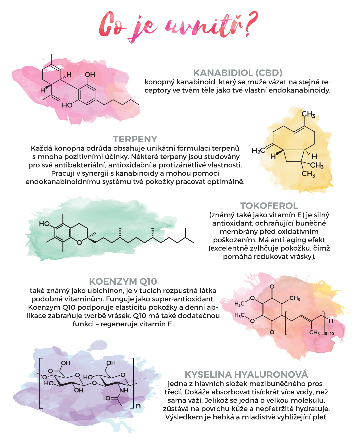 Například Karyofylen – terpen s kořenitým aroma, známý pro svou interakci s endokanabinoidním systémem těla. Je studován pro své antibakteriální, antioxidační a protizánětlivé vlastnosti. Jedná v synergii s CBD a pomáhá tvé pleti udržovat optimální úroveň vlhkosti.