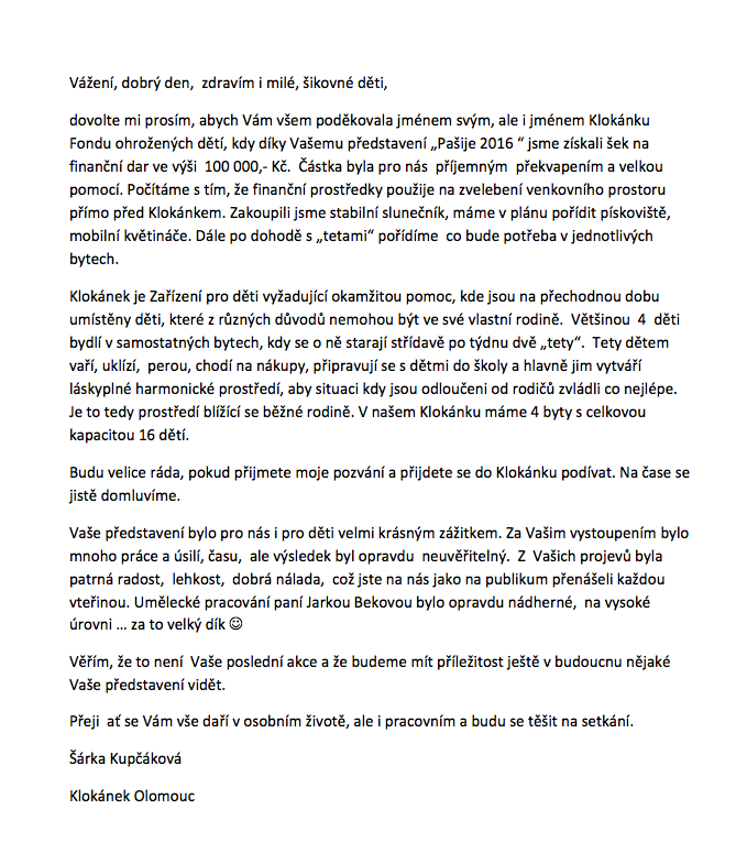 Výtěžek z premiéry Pašijí jsme se rozhodli věnovat olomouckému Klokánku, který se změnou legislativy v té době ocitl ve velmi tíživé situaci. Podařilo se nám předat jim šek na neuvěřitelných 100 000,- Kč i za účasti primátora města Olomouce. Pořídili za ně venkovní posezení, velké kastlíky se stromky na ozdobu. Zkrátka, děti už nemají jen betonový dvorek...