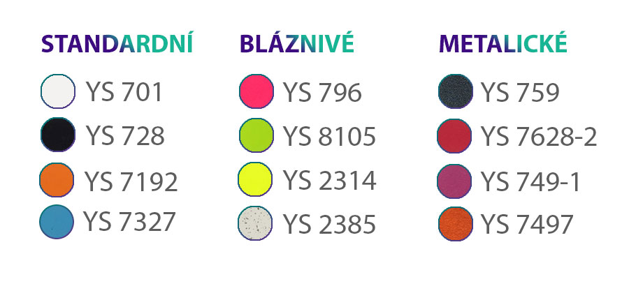 Kromě velikosti a stupně výbavy nelze zapomínat na barvu, která vyjadřuje vaši osobnost. Na výběr máte možnosti z vzorníku níže. Jen na Vás záleží, kterou si zvolíte.
