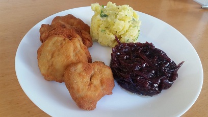 Řízečky z panenky, šťouchačky a cibulový relish / Kulajda / Kolaudační občerstvení