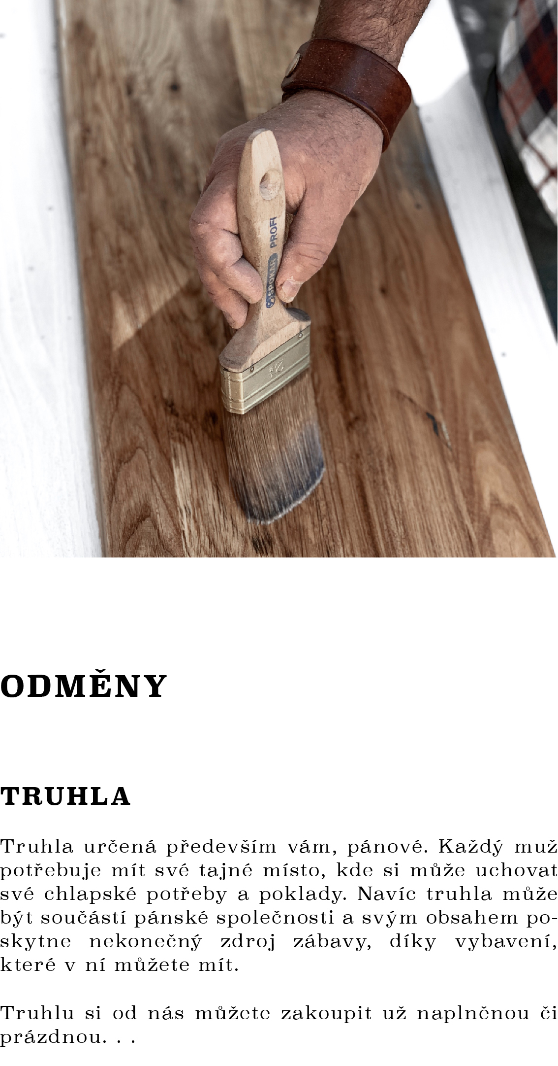 Každý muž potřebuje mít své tajné místo, kde si může uchovat své chlapské potřeby a poklady. Navíc truhla může být součástí pánské společnosti a svým obsahem poskytne nekonečný zdroj zábavy, díky vybavení, které v ní od nás naleznete.