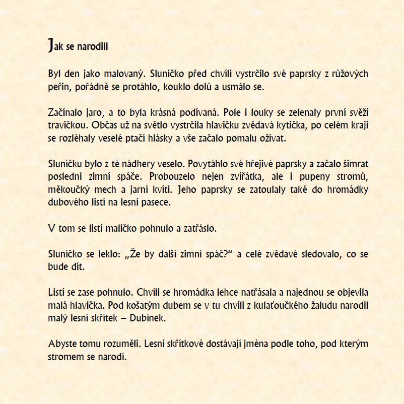 Před 10 lety tak vznikl můj první příběh na pokračování „Dubínek a Modřínek aneb malá dobrodružství lesních skřítků“, ke kterému jsem namalovala první jednoduché ilustrace, nechala je v tiskárně vytisknout, dopsala věnování a dodnes má jako "sešitek" místo v naší knihovničce.