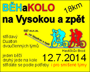 Popis: Úkolem týmu je dopravit svůj štafetový kolík na horní stanici sjezdovky Vysoká a zpět do cíle závodu na Plovárenské ulici v Havlíčkově Brodě. „Jeden člen týmu vždy běží, druhý jede na kole, zajišťuje navigaci, pitný režim týmu a občerstvení. Záleží na strategii, jak často se budou v běhu střídat. Není předepsané, jak dlouhou trať musí jednotlivý závodník uběhnout. Nutné je, aby vždy jeden člen týmu běžel. Teoreticky je možné, aby 18 kilometrů uběhl jeden závodník, a druhý závod odjel na kole. Podmínkou závodu je to, že štafetový kolík se nesmí vézt na kole. Soutěží týmy mohou být smíšené, tedy kombinace závodníků a závodnic. Závod je tedy určen pro všechny, samozřejmě s odpovídající fyzickou kondicí pro zdolání délky trasy. Cyklistické přilby jsou povinné a za nedodržení tohoto nenese pořadatel žádnou odpovědnost.