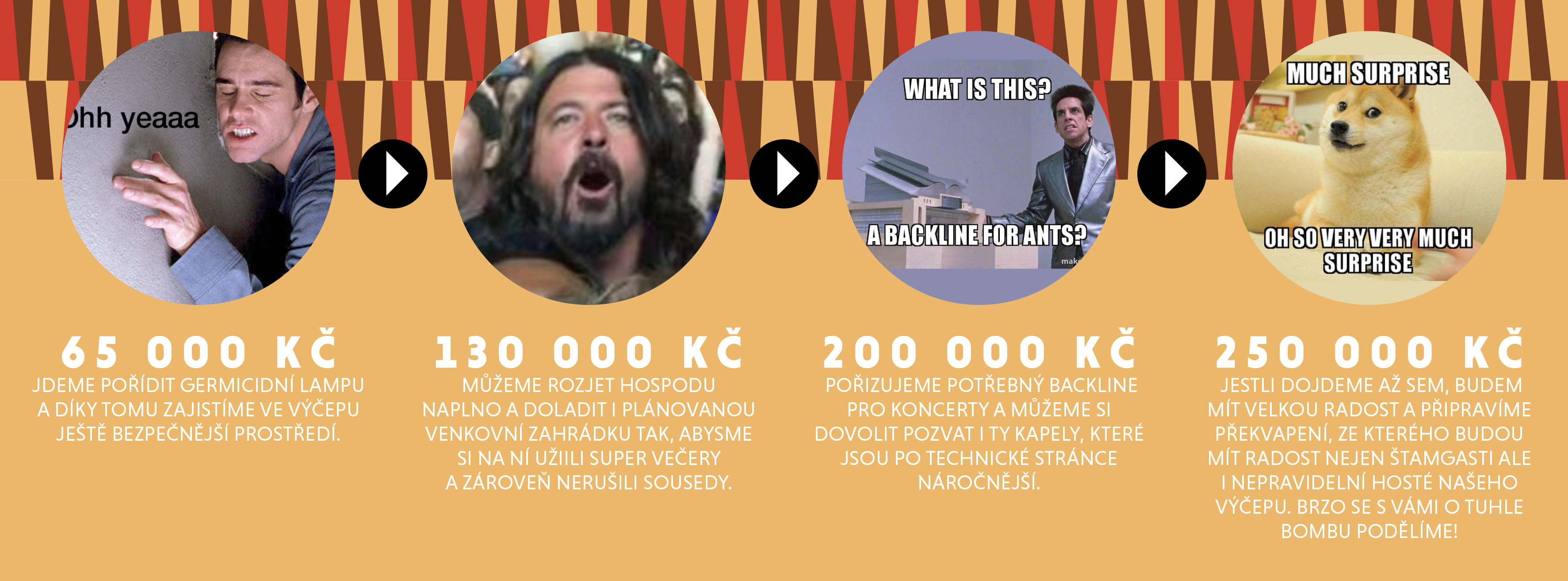250 000 Kč - Jestli dojdeme až sem, budeme mít velkou radost a připravíme překvapení, ze kterého se budou radovat nejen štamgasti, ale i nepravidelní hosté našeho Výčepu. Brzy se s vámi o tuhle bombu podělíme!
