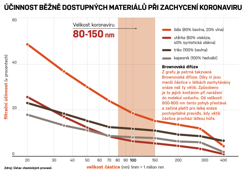 Zde je pro srovnání graf filtrační účinnosti běžně dostupných materiálu pro výrobu roušek :