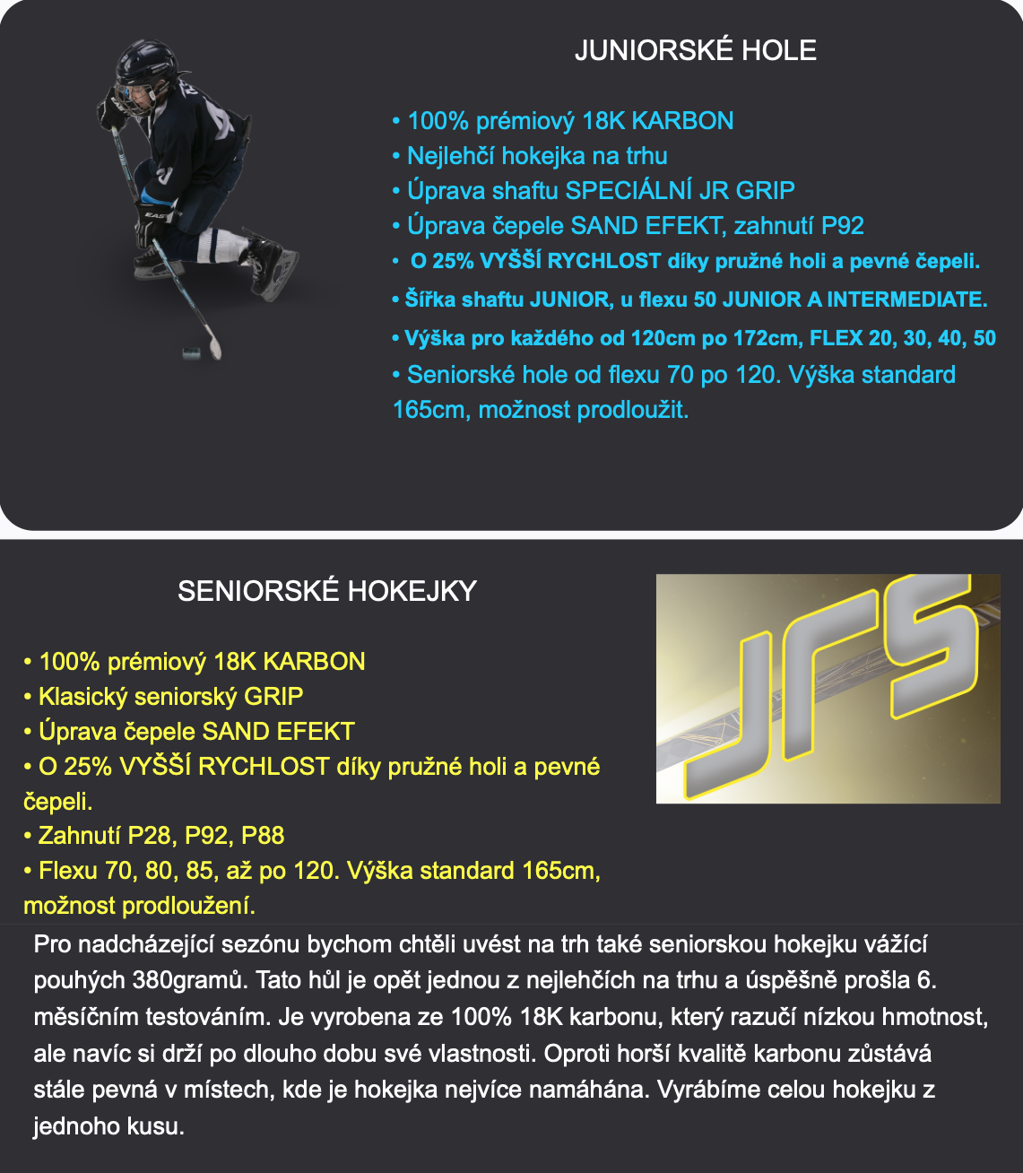 20ks prémiových 100% karbonových dětských hokejek JR HOCKEY dle vlastního výběru.