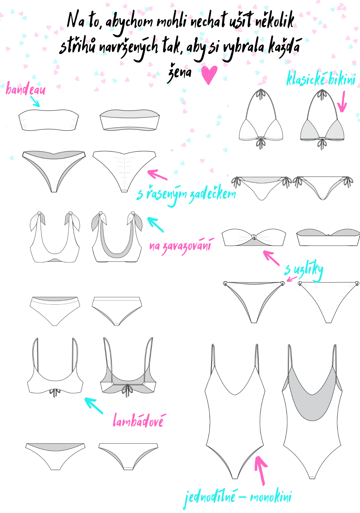 Střihy jsou vybírány tak, aby vyhovovaly každé ženě. Po ušití NIKIN Vám bude zaslán odkaz, kde si budete moci vybrat velikost, barvu a střih Vašich NIKIN.