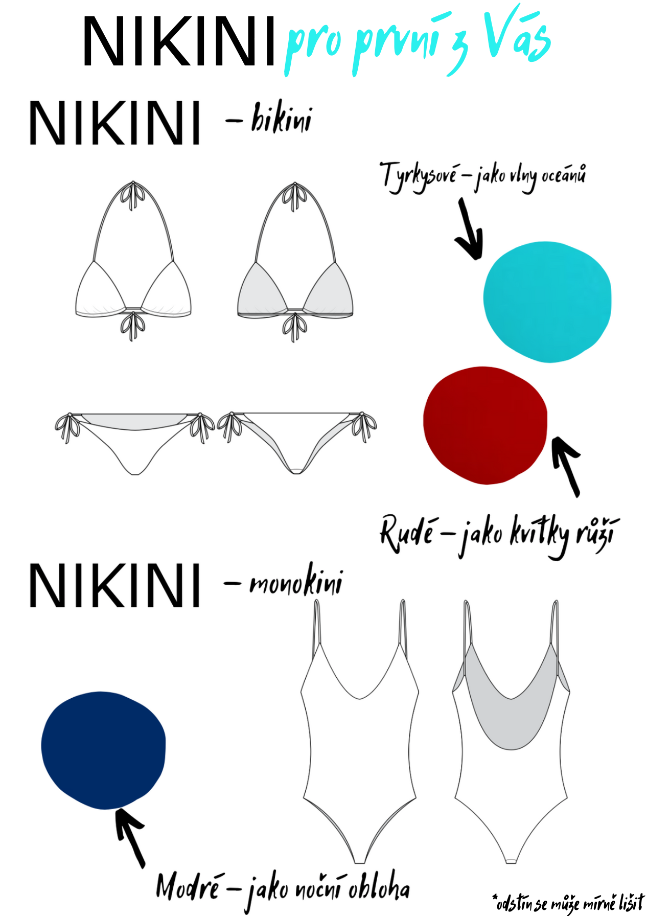 NIKINI bikiny - jsou dvoudílné plavky klasického bikinového střihu (set spodního a vrchního dílu). Tato varianta je ideální volbou, protože si jak vrchní, tak spodní díl utáhnete dle potřeby, takže téměř nelze šlápnout s velikostí vedle. Pokud byste si však i přesto s velikostí nebyli jistí, připravili jsem pro Vás jednoduchou tabulku, ve které zjistíte, jaká velikost Vám padne. :) Tabulku naleznete v popisu projektu společně s barvou a střihem plavek. <3