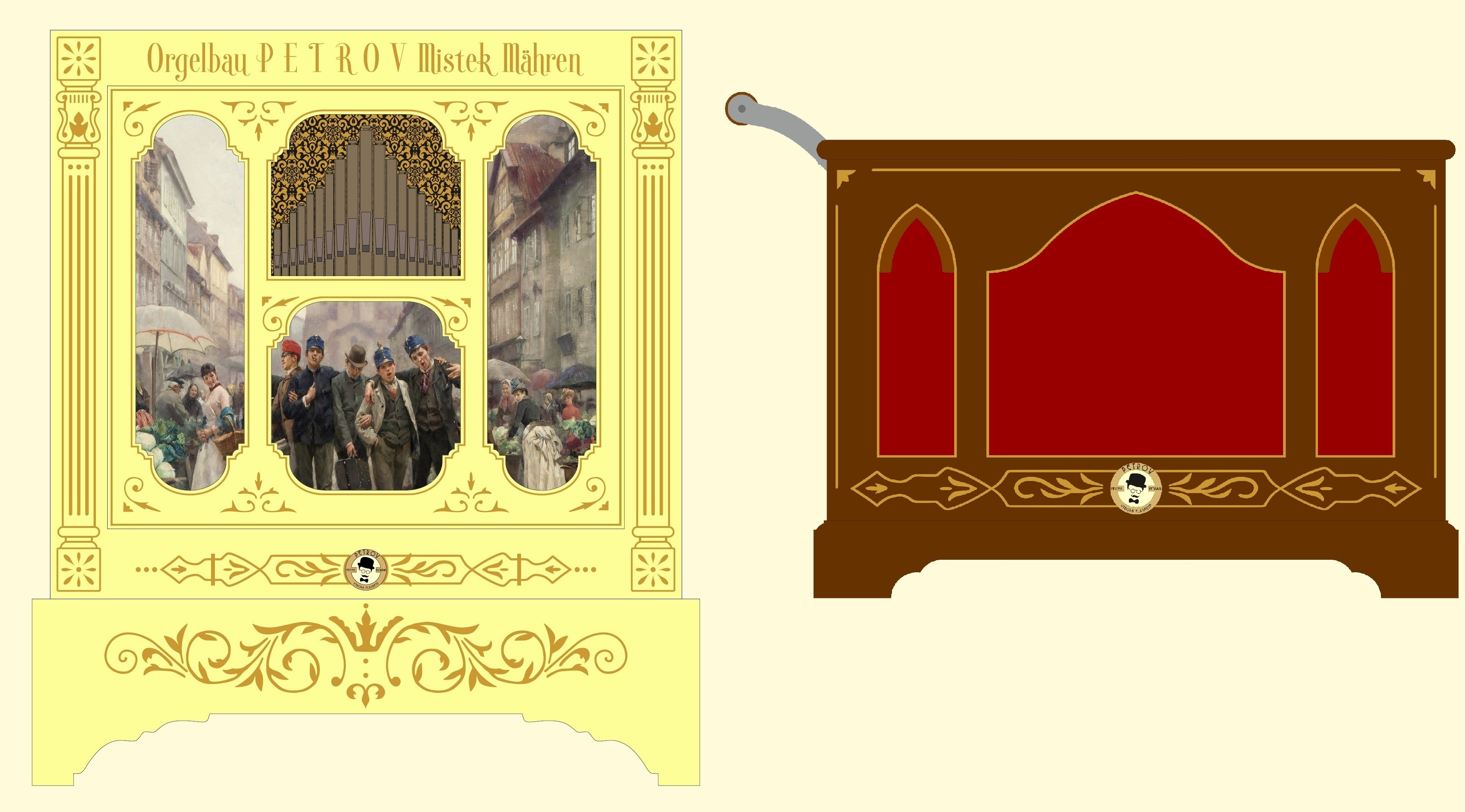 vlevo nahoře: Návrh čela velkého mechanického flašinetu