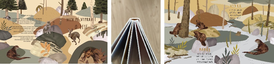 Knihu chceme vydat jako vazbu layflat, která je odolná a vhodná i do nejmenších rukou. Pro představu - jako velké leporelo v rozměru 20 x 24cm. Na čtrnácti stranách se seznámíte se třinácti zvířaty, které můžete volně potkat v našich lesích. Básničky v knížce jsou složeny z hlásek těžkých na výslovnost, které je třeba s dětmi neustále procvičovat. Právě proto jsou krátké, a tím pádem jednoduché na zapamatování. V každé básničce si děti procvičí několikrát stejné sloveso a zároveň v nich naleznou obecná fakta o zvířatech. Ilustrace v knize jsou cíleně namalované tak, aby děti zaujaly a přitom jim nezkreslily reálný vzhled zvířat. Pozadí v ilustracích je více abstraktní, aby dalo prostor k vyniknutí obrázku zvířete.