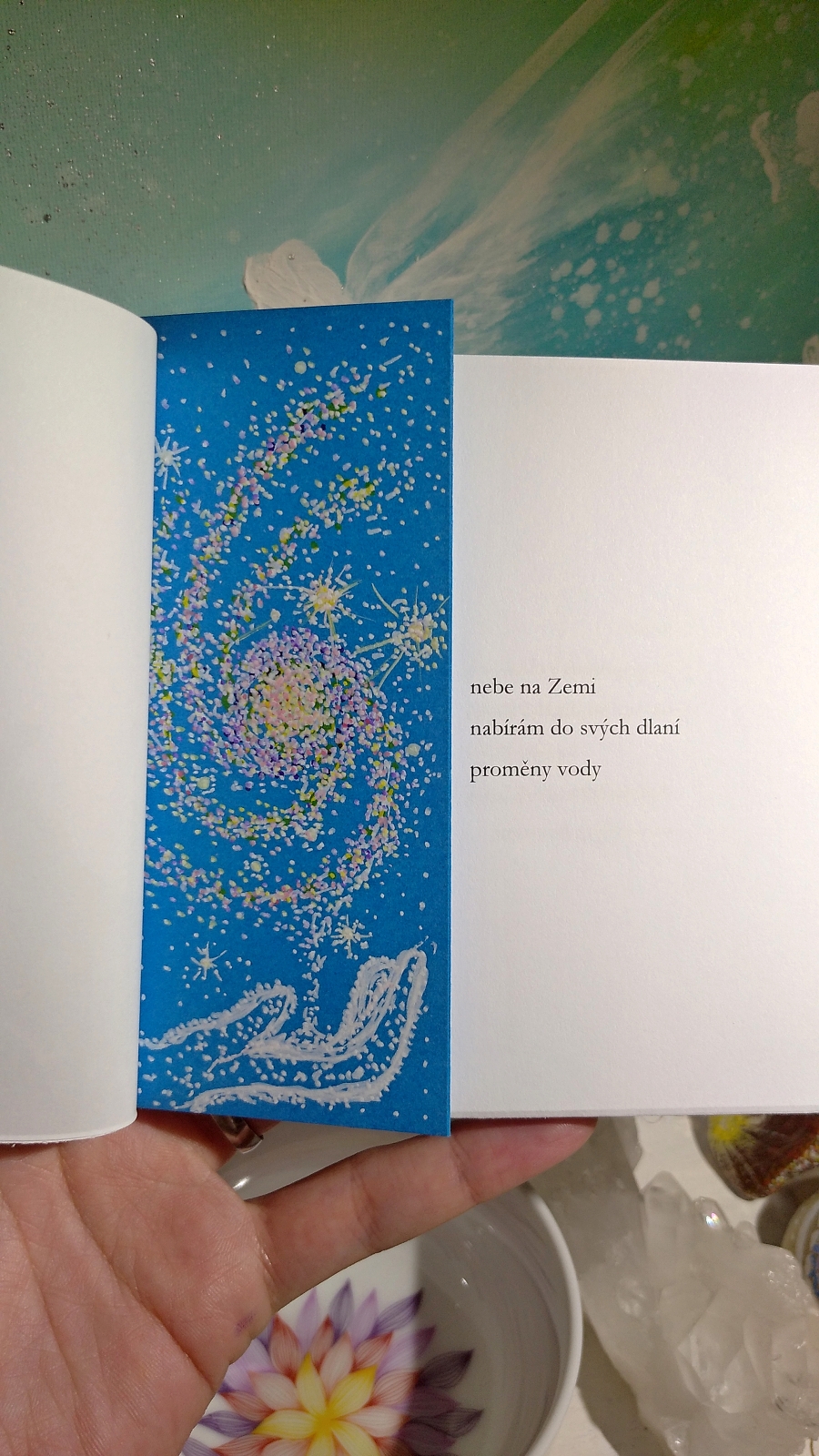 Sbírku bych chtěla vydat pro všechny snivce, vodomilce, milovníky přírodních miniatur, léčivých barev a slov, která vyvěrají z jednoho Zdroje, aby se jako voda po kapkách oddělovala a zanechala svoji stopu v mysli nebo vědomí čtenáře... a zároveň se spojovala do jednoho toku myšlenek, proudila životem, dlaněmi či ústy a obohacovala tak svět v jiných podobách...