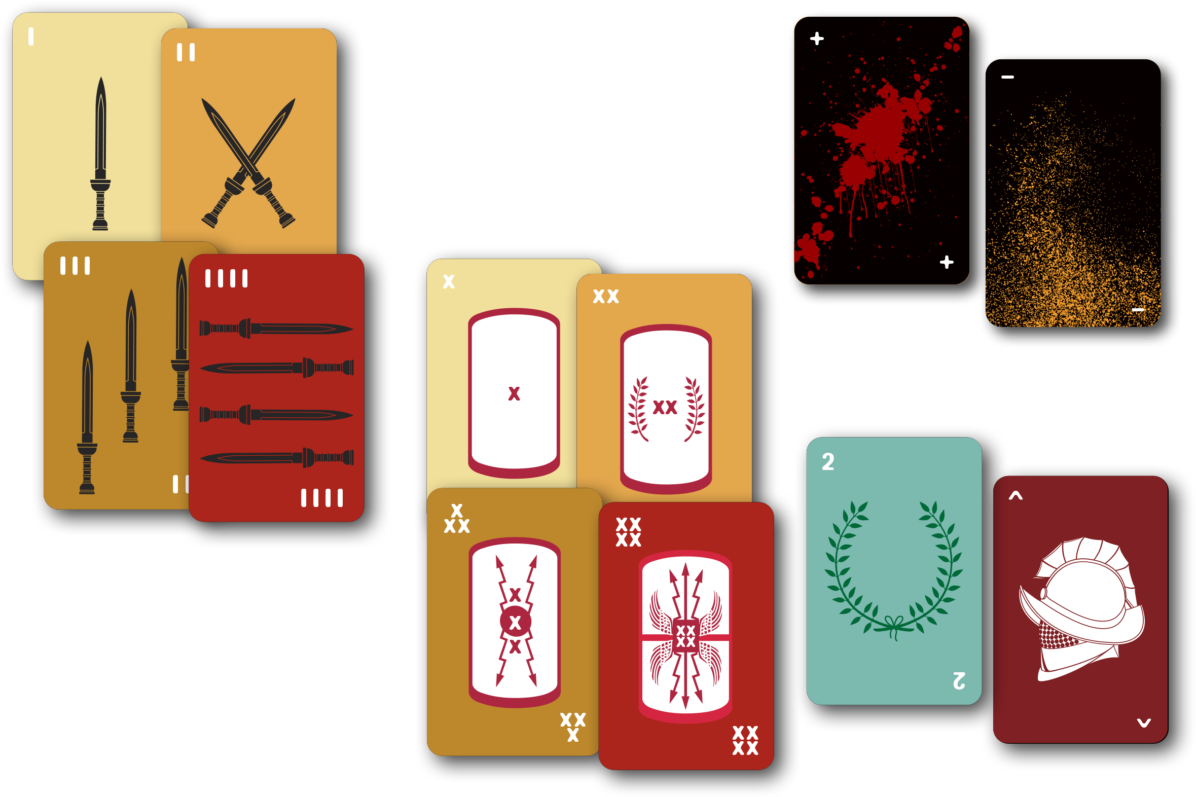 > 96 karet celkem (28 karet útoků, 22 karet obrany, 46 akčních karet + 20 denárů > mince pro počítání bodů)