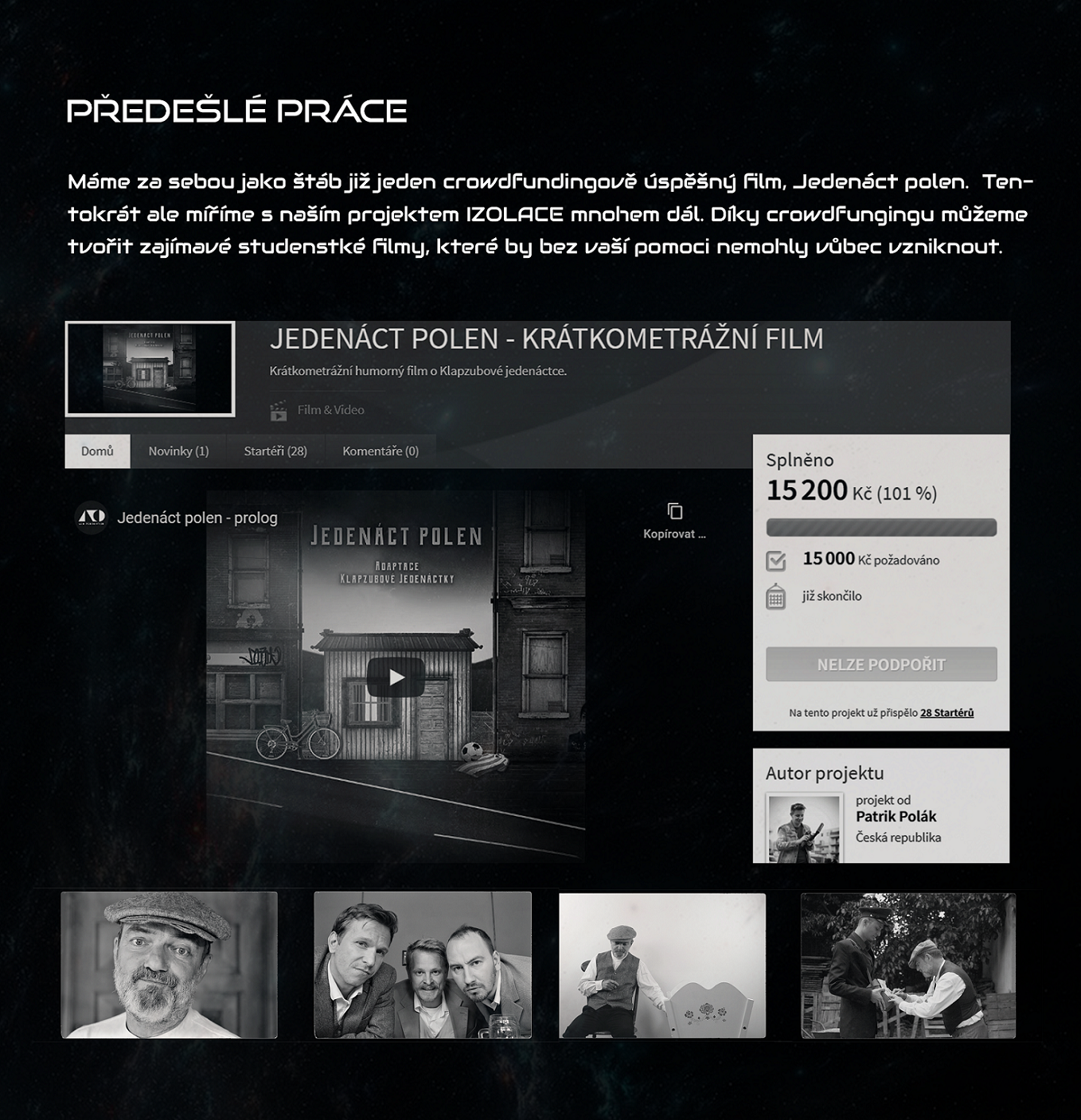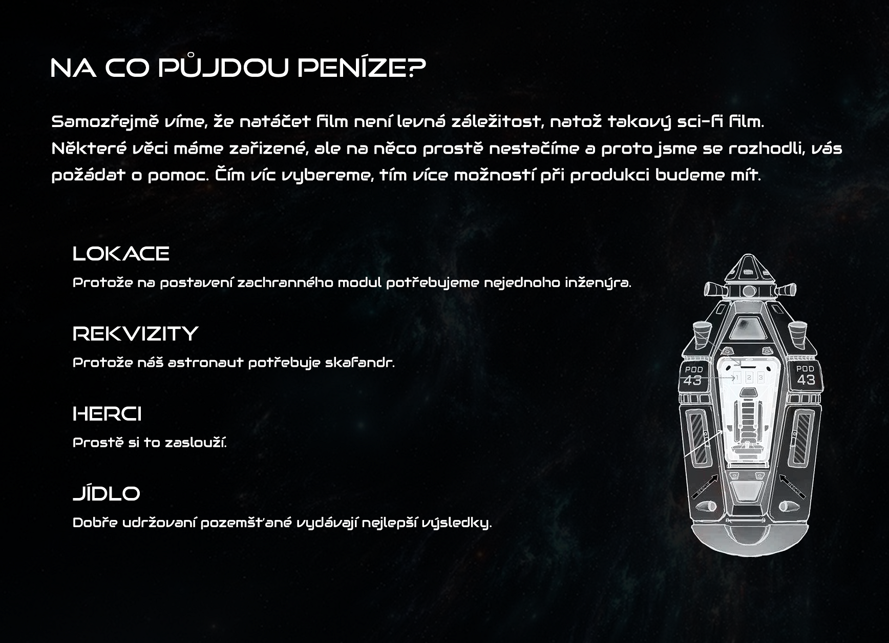 Co takhle logo firmy na skafandru? Jméno na plakátě či v titulkách? Děkovné video od štábu, nebo rovnou všechny ostatní odměny? Jako generální partner podpoříte tento film v největším měřítku a my vás podle toho odměníme.