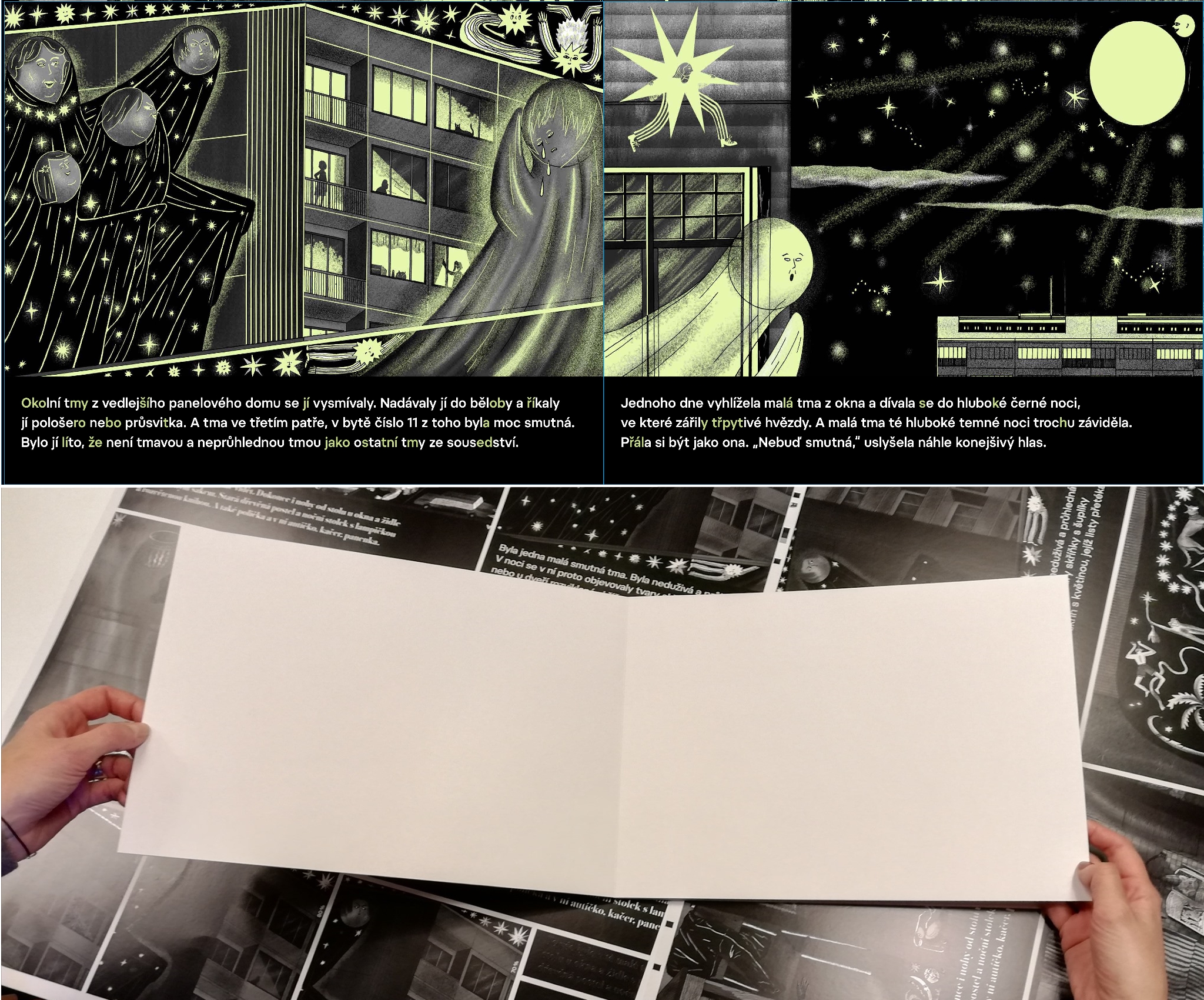 Kniha o rozměru 35x26 cm se bude tisknout ofsetovým UV tiskem a sítotiskem s luminiscenční barvou na tvrdý a odolný „leporelový“ karton ve vazbě layflat, kterému se říká také panorama. Kniha je po otevření plochá jako jednolitá deska a celostránkové ilustrace o to více vyniknou. Co kniha dále nabízí: