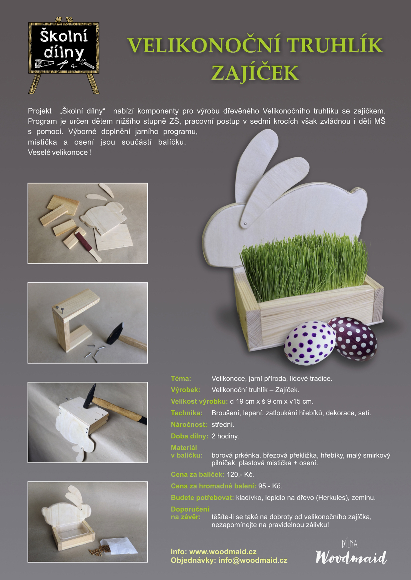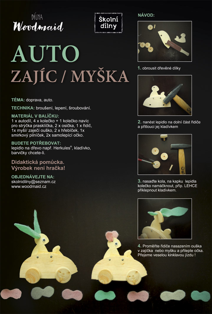 Výrobky sice mají konkrétní tvar, ale snažíme se co nejméně diktovat jejich finální podobu. Na každé dílenské stavebnici je práce tak akorát, aby se dala zvládnout v běžných školních nebo domácích podmínkách. Stačí si půjčit od školníka /nebo souseda/ kladívko a trochu lepidla.