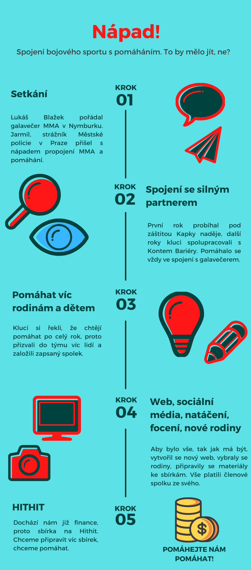Projekt MMA pomáhá vznikl současně s pořádáním galavečera MMA, který probíhal v Nymburku v roce 2016. Cílem bylo udělat něco pěkného, dobrého a smysluplného. Sekundární myšlenkou bylo ukázat tento sport v lepším světle. MMA není jenom o bušení a mlácení, je hlavně o lidech a také o tom lepším v každém z nich/nás. První sbírka vznikla pod názvem „Zápas pro dobrou věc“ a probíhala za spolupráce s Kapkou naděje. Sbírka byla úspěšná, proto se uspořádala druhá sbírka za spolupráce s Kontem Bariéry, tato spolupráce probíhala několik let - celkem za ty roky bylo vybráno cca 1 500 000 Kč. Nyní jsme se rozhodli založit zapsaný spolek, protože chceme pomáhat víc.