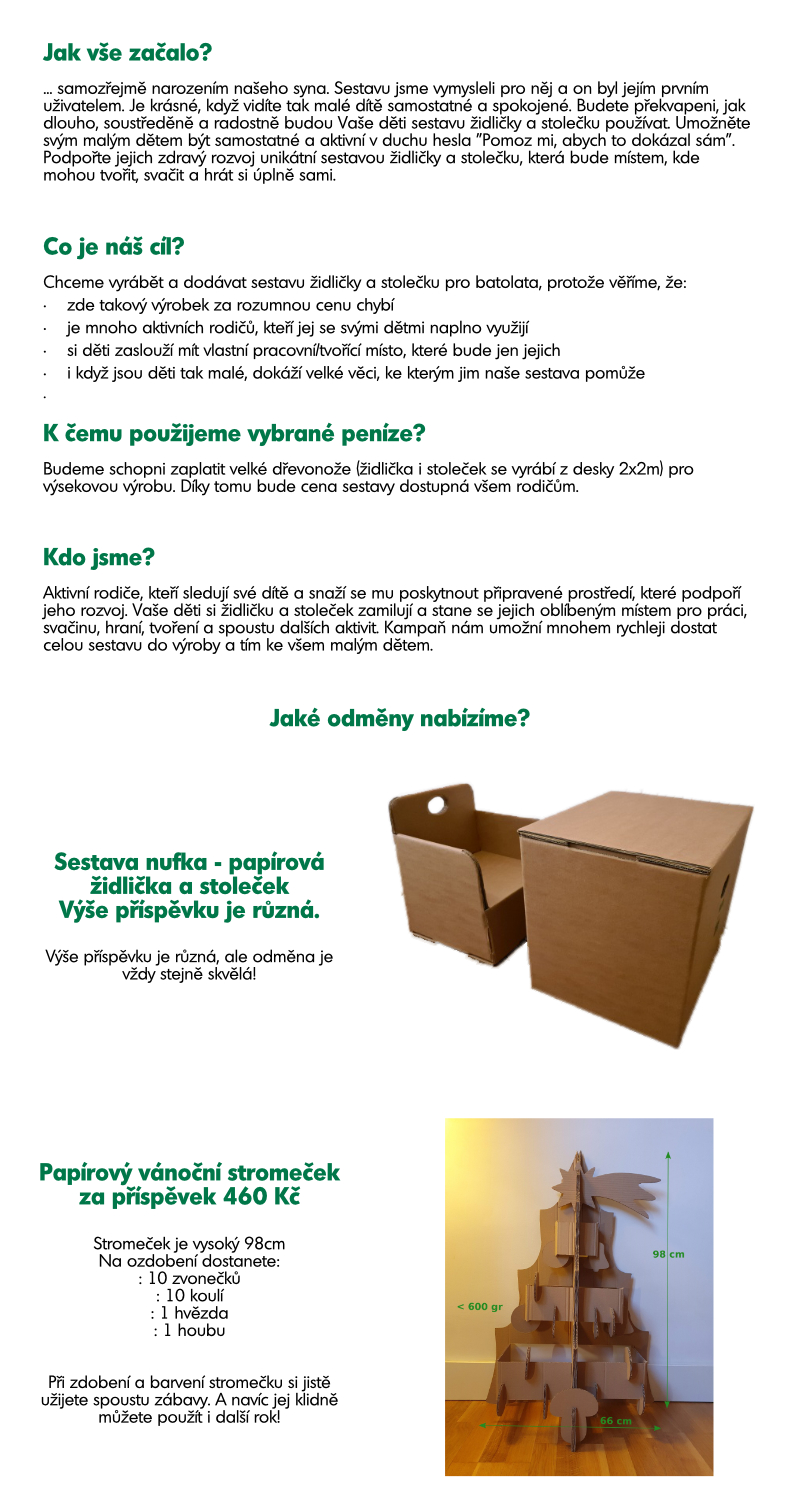 Naše děti už jsou moc velké na Vaši židličku a stoleček, ale ozdobit unikátní kartonový stromeček je bude určitě bavit. Stromeček je vysoký 98cm a je k němu 10 zvonečků, 10 koulí, 1 hvězda a 1 houba.