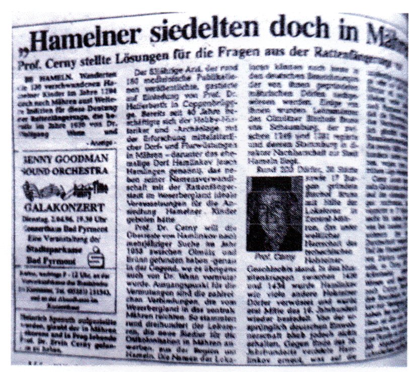 …Rozhodně však ne historie. Německý archivář a badatel Wolfgang Wann ve starých kronikách nalezl zmínku, že hamelnské děti byly roku 1284 odvlečeny na Moravu mezi Olomoucí a Brnem. Toho se chytil podomský rodák Ervín Černý Křetínský, který od padesátých do osmdesátých let díky své disciplíně „historická geografie“ nalezl na Vyškovsku, Blanensku a Prostějovsku 62 zaniklých vsí a podrobně je zanesl do map včetně plužin. Mezi nimi zakreslil a popsal také HAMLÍKOV (Hamlingen) ležící mezi Podomím a Ruprechtovem a usoudil, že právě sem byly děti odvlečeny. U věhlasných světově uznávaných historiků, zabývajících se celý život středověkou událostí, to způsobilo senzaci poté, co tuto teorii vyslovil a obhajoval MUDr. Černý Křetínský na konferenci v Hamelnu. Následovala mezinárodní návštěva na Moravu. Oponovali, že do tak malé vsi (měla sotva 20 obydlí), by se 130 dětí nevměstnalo. Černý však vysvětloval, že byly rozmístěny do několika přilehlých osad.