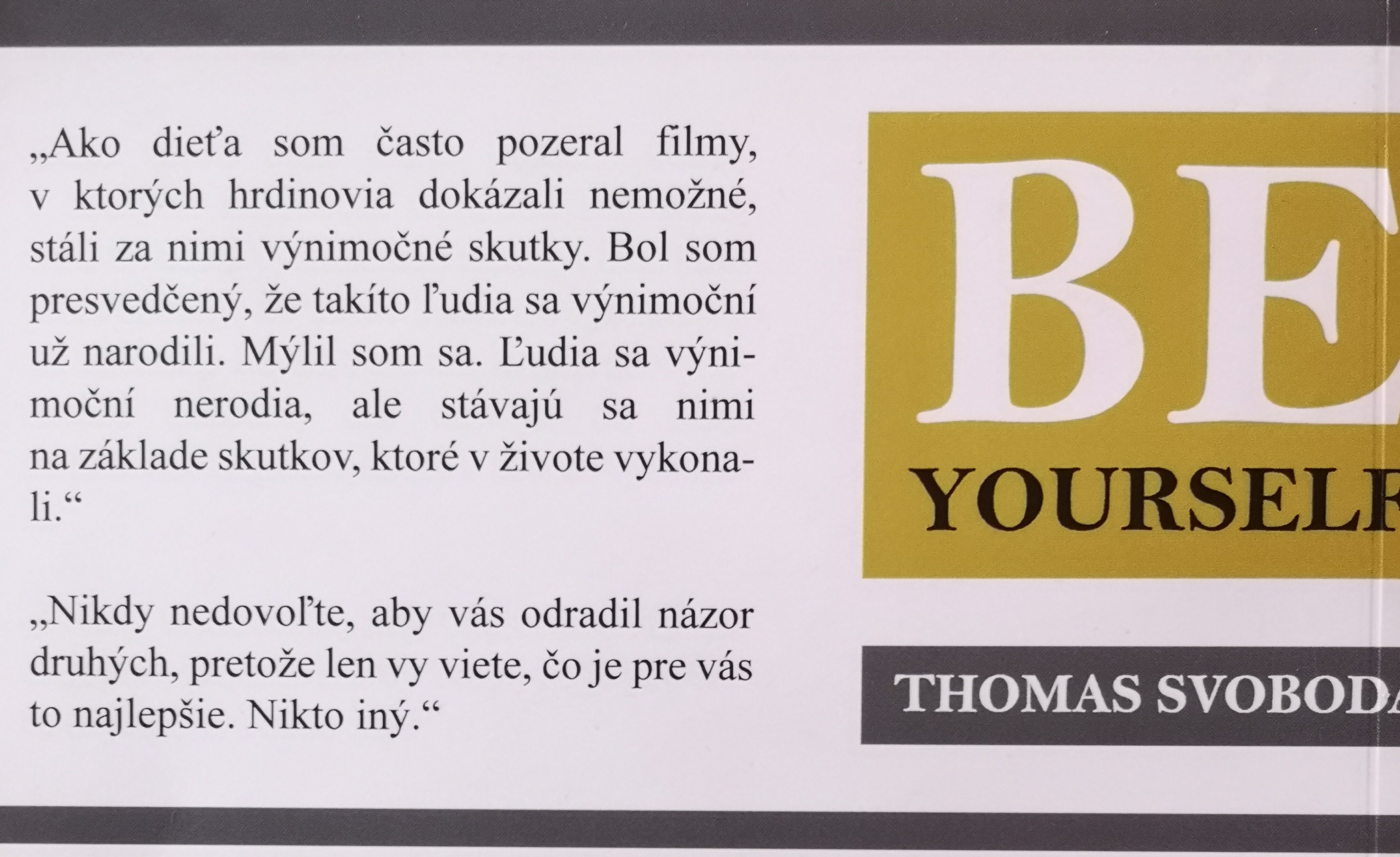 Ako to už ale v živote býva, nie všetko ide podľa nášho plánu. Mojou achillovou pätou bola moja naivná dôvera voči partnerom. Som však vďačný za všetko, čo sa mi stalo, pretože ma to zmenilo, posilnilo a naučilo byť za všetko vďačný. Sú to práve skúsenosti, ktoré ma priviedli k presvedčeniu zamerať sa v živote na to, čo mi dáva význam a zároveň ma robí šťastným. Moje životné presvedčenie a hodnoty ma priviedli k myšlienke napísať knihu Be Yourself.