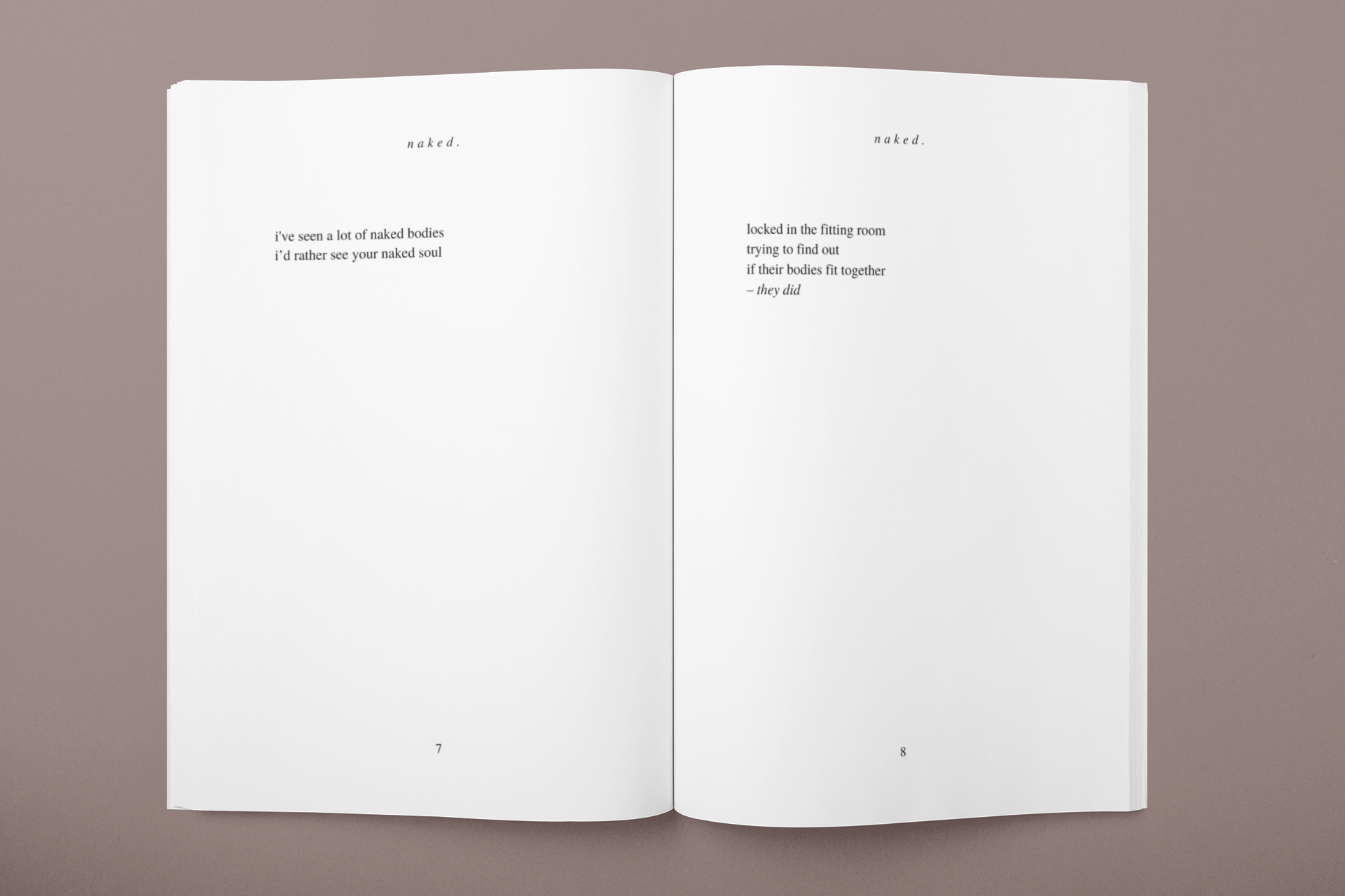 Básně jsou pro mě jako vakcína proti beznaději a smutku. Vakcína, která nám dává pocit sounáležitosti. Pocit, že to, co právě prožíváme, prožívá i někdo jiný. Že nejsme sami. Že se v těch pár slovech najdeme. Pochopíme se. A je nám líp. NAKED jsem začala psát pro sebe, vydávám ji pro vás. Aby vám dodala nadhled, naději nebo jen úsměv na rtech.