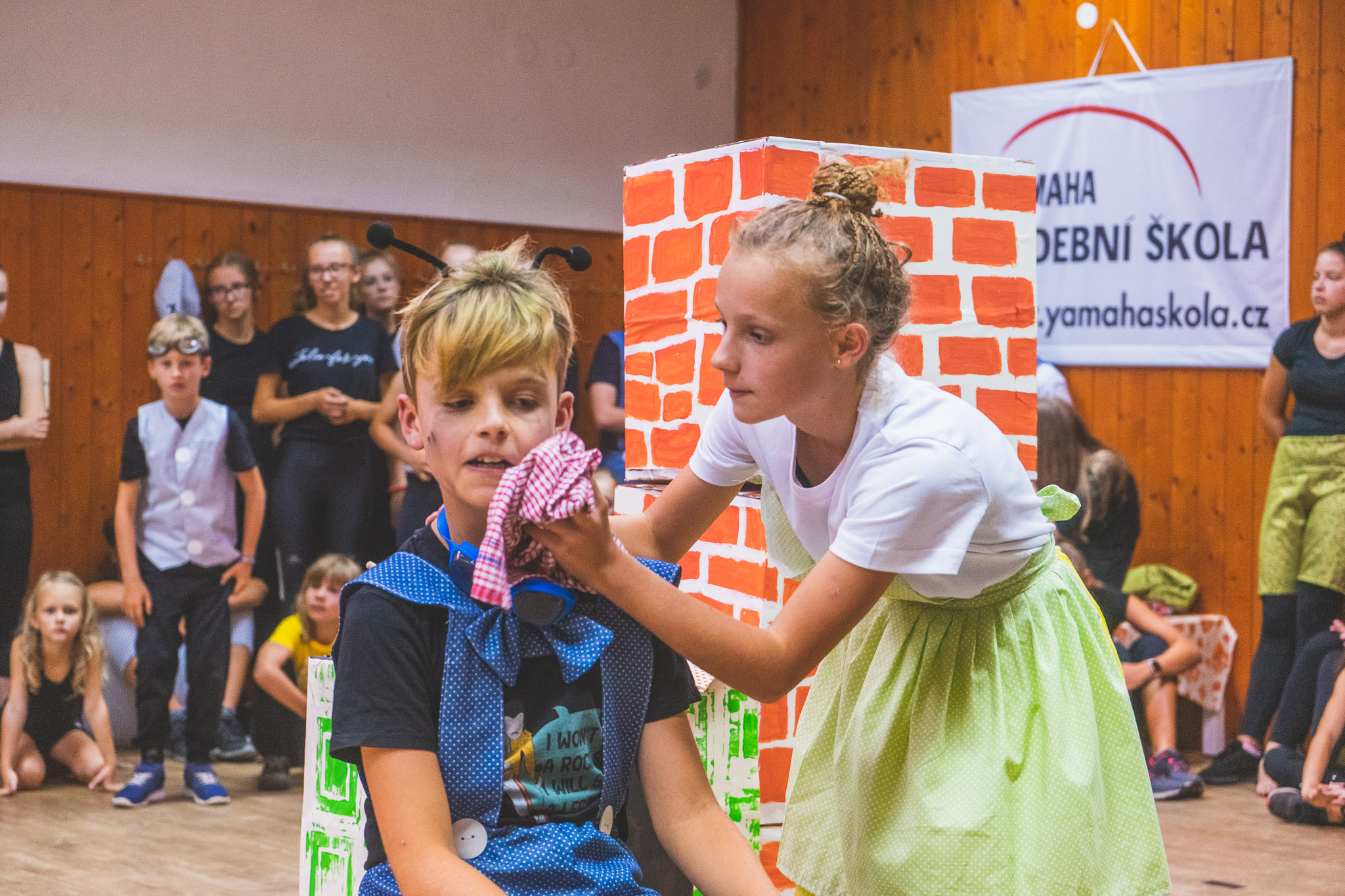 V rámci tábora s dětmi nacvičujeme muzikál na motivy známého dětského příběhu a pro hudbu vybíráme písně nějaké slavné kapely, které přetextujeme do češtiny – letos to bude Alenka v říši divů na hudbu skupiny Queen. Do muzikálu zapojujeme všechny účastníky tábora.