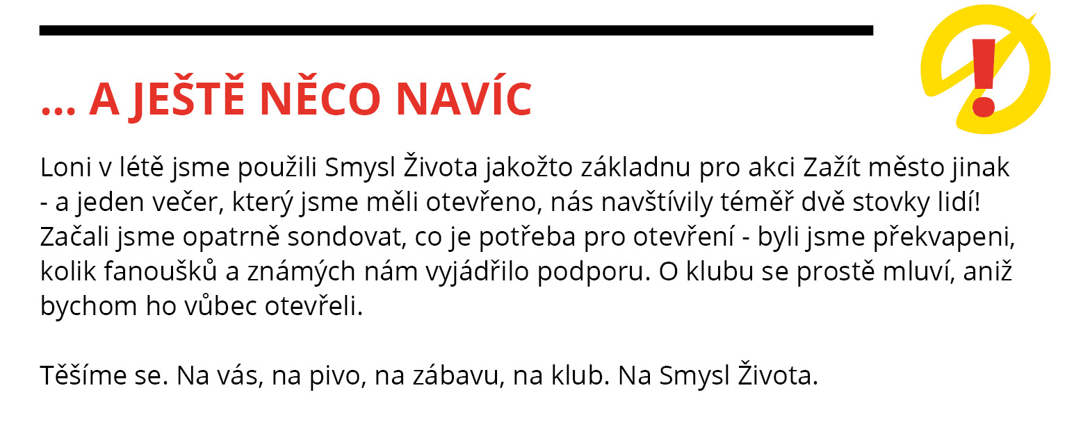 Buď u toho, kdy se poprvé otevře Smysl Života! Křest klubu proběhne ještě před oficiální otevíračkou. Pivo, víno, standup comedy, deskové hry - všechno bude. Pozvánku dostaneš do mailu.