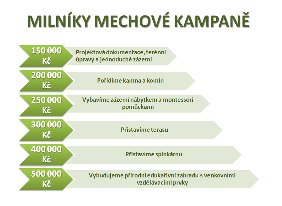 Chceme vytvořit pro děti a jejich rodiny, průvodce naší školky úžasné místo, kde budou mít zázemí pro setkávání a velký kus přírody kolem sebe, která je sama o sobě podnětným místem pro růst, tvořivost a vše, co k našemu konceptu potřebujeme.