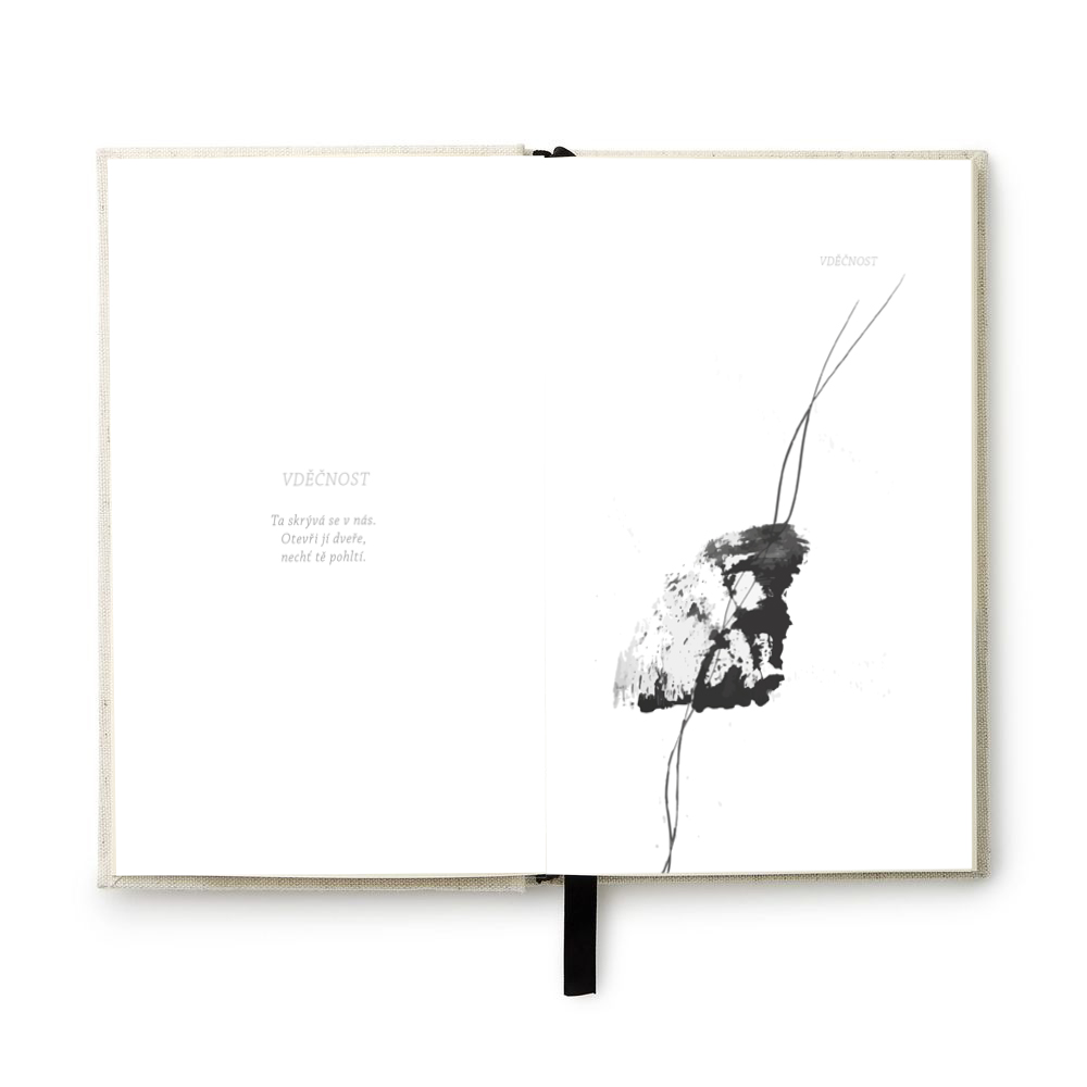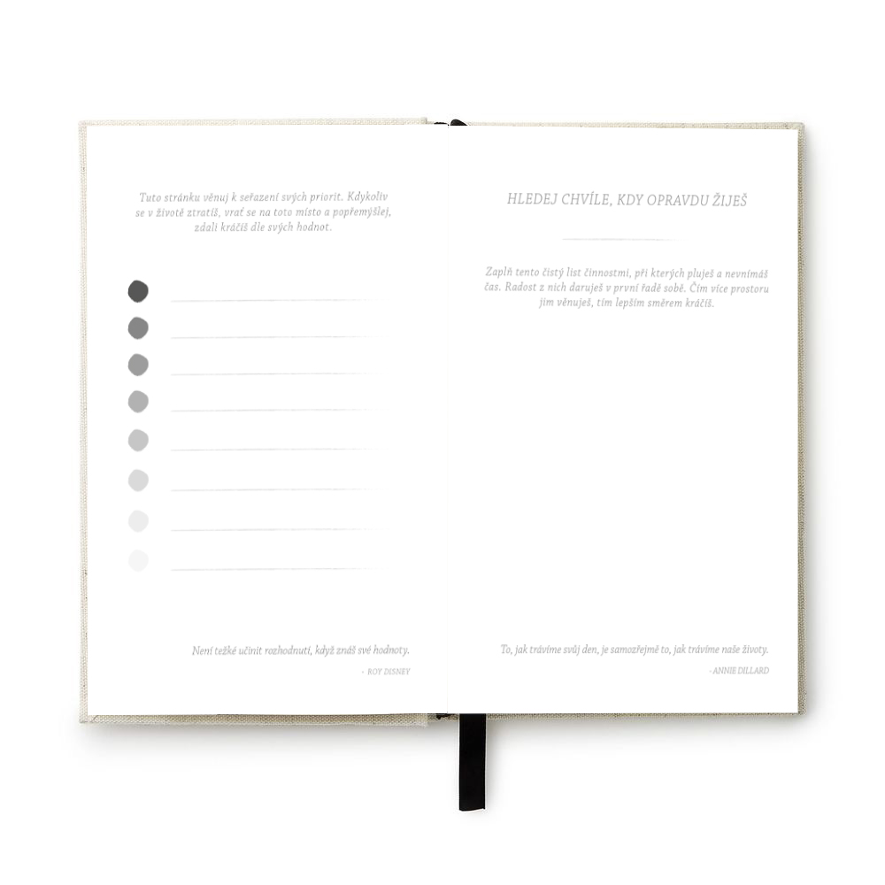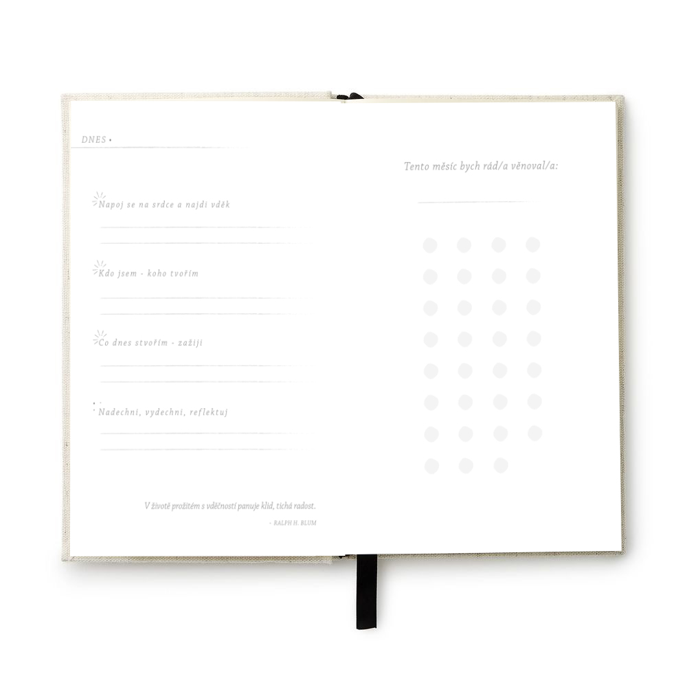Je pro mě také velmi důležité vydat kvalitní deník, který si člověk zamiluje i pro jeho propracovaný vzhled. Vazba je navržena textilní s ražbou. Věřím, že psát si do deníku každé ráno a večer, bude hřejivým momentem.