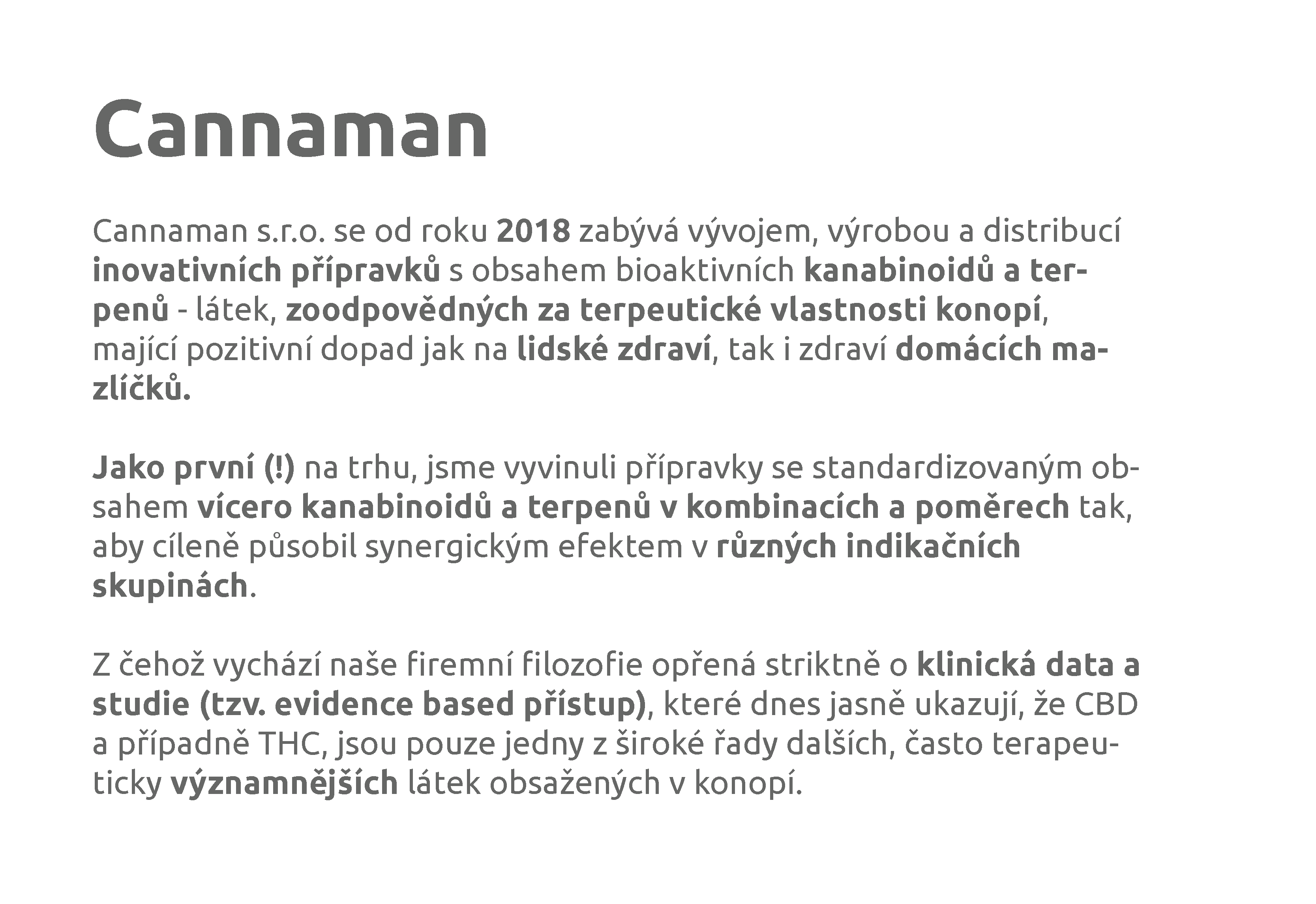 Výše uvedené informace mají pouze informativní a edukativní charakter. Uvedené informace jsou explicitně vyjádřené subjektivní zkušenosti konkrétních dlouhodobých uživatelů přípravků zn. Cannaman, a také výkladem odborných pracovníků. Tyto informace nenahrazují žádné lékařské doporučení, a přípravky nejsou určené k léčení nebo předcházení nemoci u lidí. Vyhrazujeme si právo na dodatečnou změnu obsahu, složení přípravků i obalového materiálu.