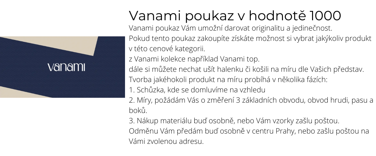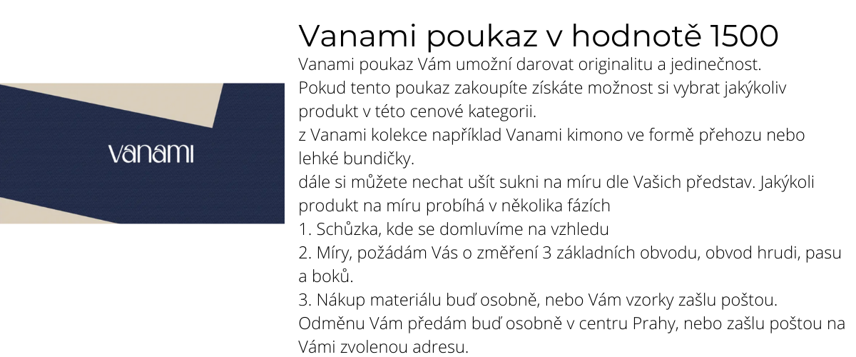 Vanami je značka dámského oblečení, která šetří čas i přírodu. Její jméno je odvozeno z variabilní a na míru. To je heslo i koncept, který představuje. Na českém trhu mi chyběla značka, která by nabízela oblečení, ve kterém můžete jít na co nejširší spektrum událostí. První Vanami kolekce nabízí sadu základních prototypů na míru, které správnou kombinací můžete nosit takřka kamkoli. Mezi zmíněné prototypy patří kalhoty, lehká bunda, kimono, zimní kabát a top.