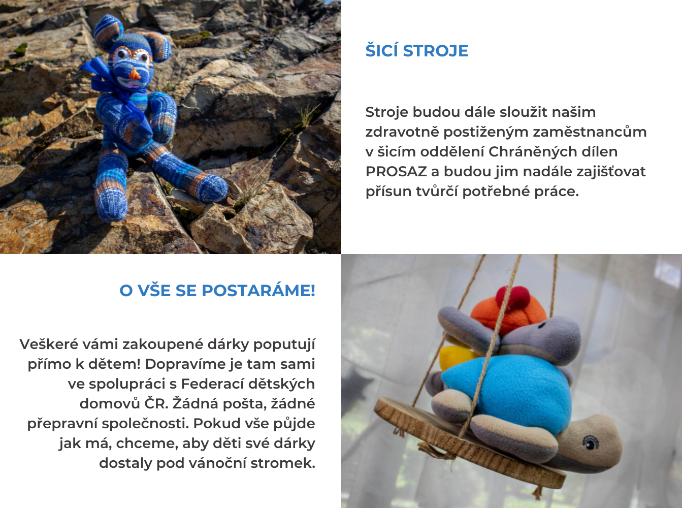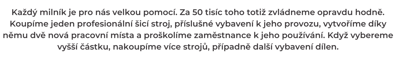 Chcete pro naší dlouhodobou spolupráci s dětskými domovy udělat skutečně maximum? Kupte nám jeden šicí stroj a staňte se partnerem naší kampaně. Na vámi koupený šicí stroj umístíme plaketu s vaším jménem. Další hmotnou odměnu pro vás ale nemáme. Jako poděkování vám ale zašleme kupón na slevu 20 % na jeden nákup v našich prodejnách nebo e-shopu, platný po celý rok 2022. A hlavně, až bude vše hotové, dáme vám vědět, jak předání dárků dětem proběhlo.