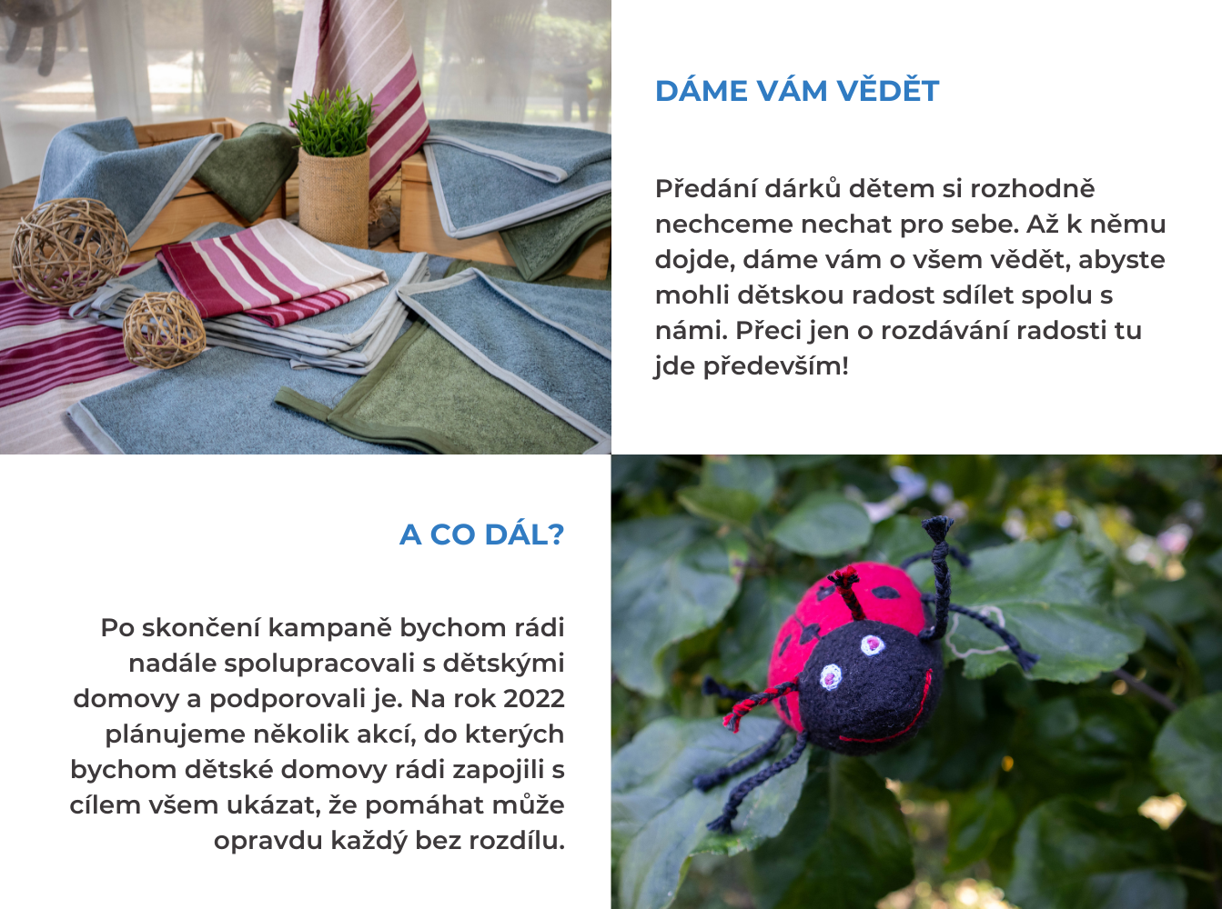 Darujete do dětského domova ručník z kvalitního froté vhodný na vysušení hlavy, nebo i celého těla. Pro vás hmotnou odměnu nemáme. Jako poděkování vám ale zašleme kupón na slevu 20 % na jeden nákup v našich prodejnách nebo e-shopu, platný po celý rok 2022. A hlavně, až bude vše hotové, dáme vám vědět, jak předání dárků dětem proběhlo.