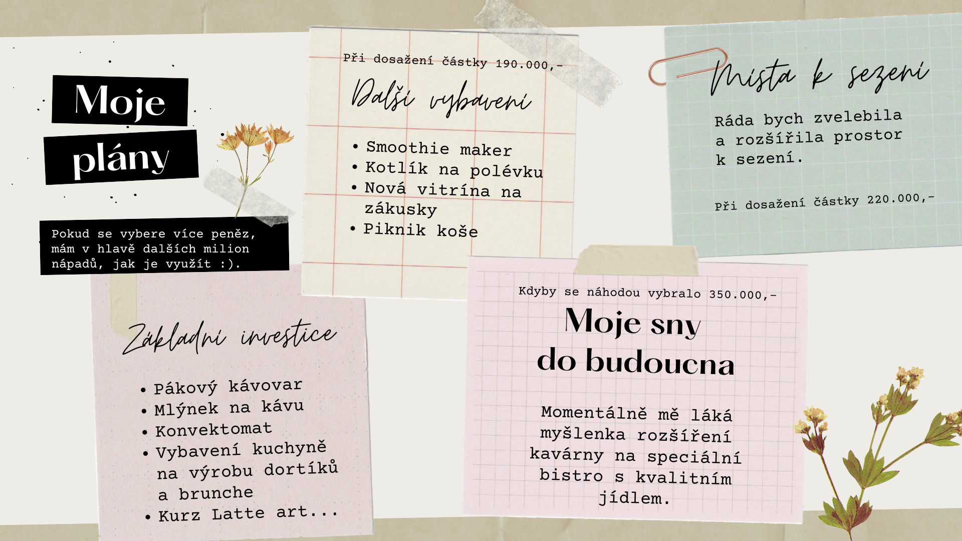 Snažím se vybudovat kvalitní podnik, kde vždy zákazník dostane jen to nejlepší. V našem malém městě mi chybí možnost zajít si na opravdu kvalitní kávu a jídlo. Proto bych ráda takové místo s Vaší pomocí vytvořila.