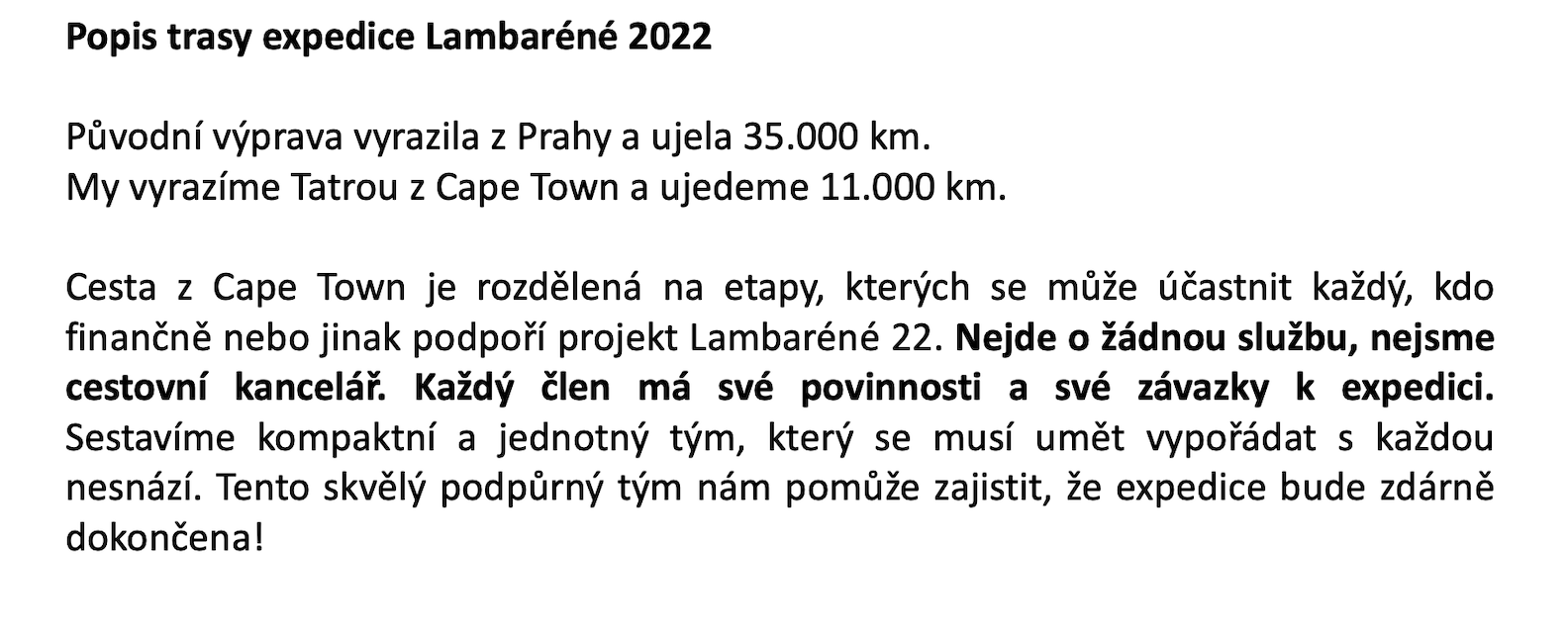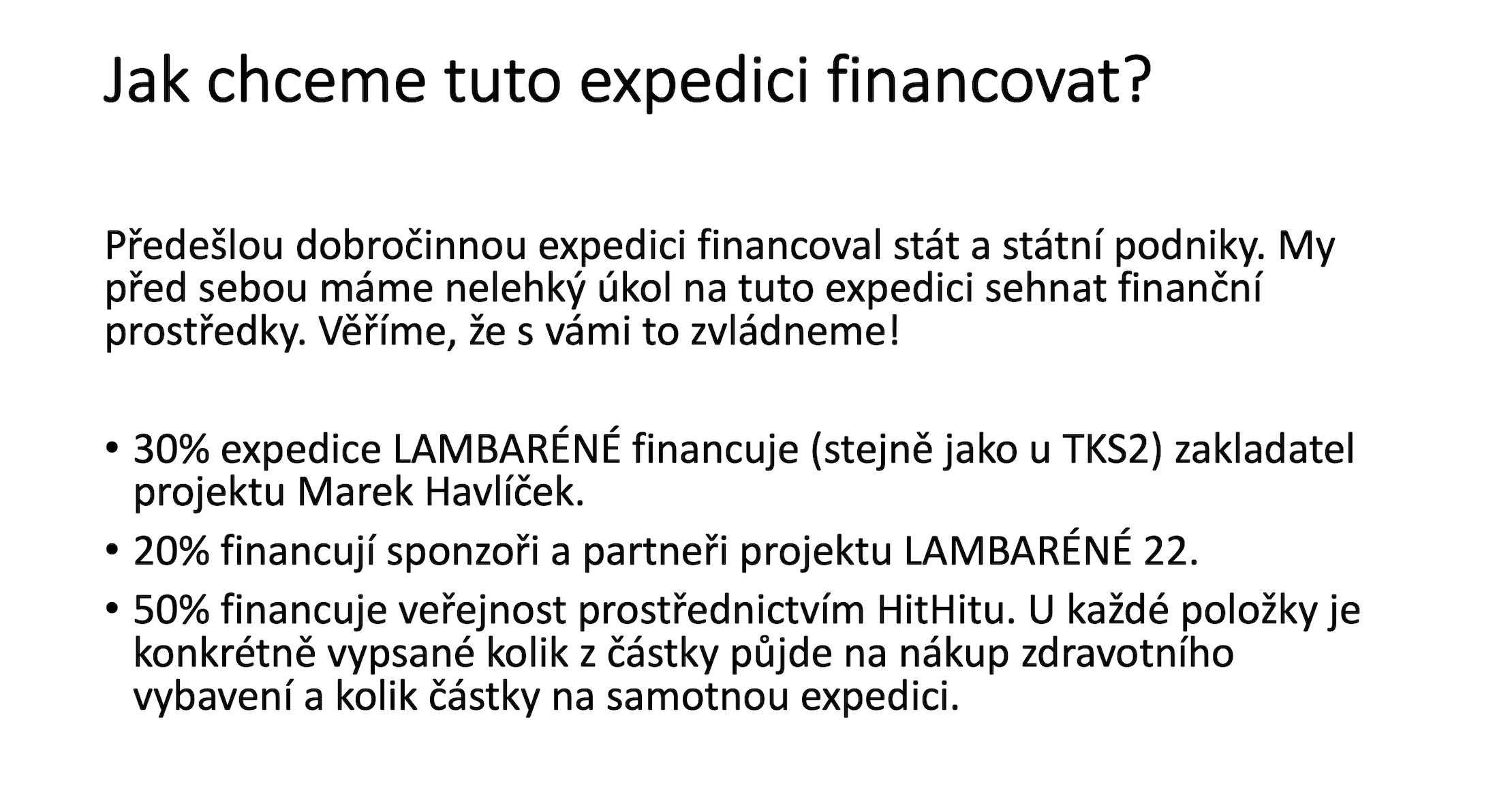 Zrealizovat expedici Lambaréné 22 je naší vnitřní povinností. Jsme připraveni do projektu vložit maximum, ale i přesto to nestačí a zvládneme to pouze a jen s vaší pomocí!
