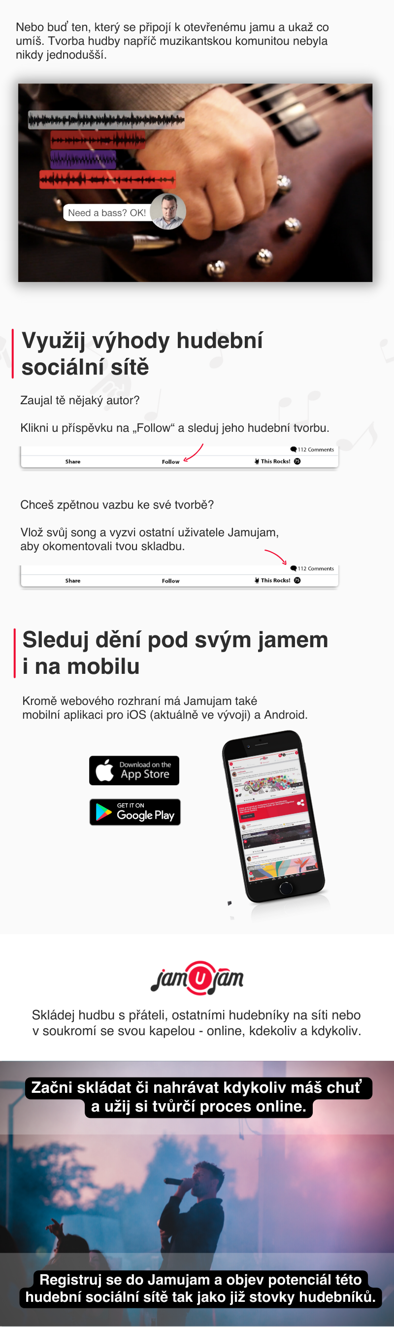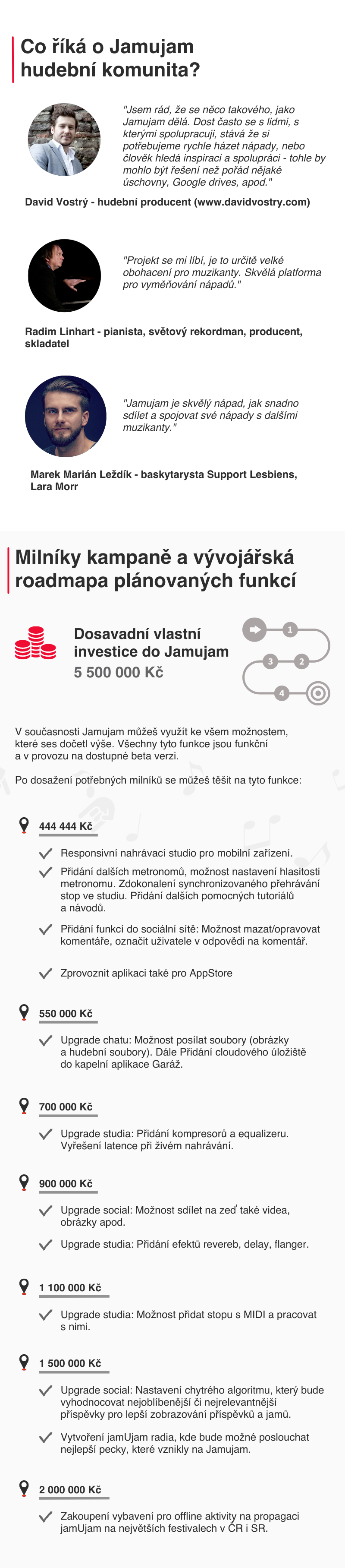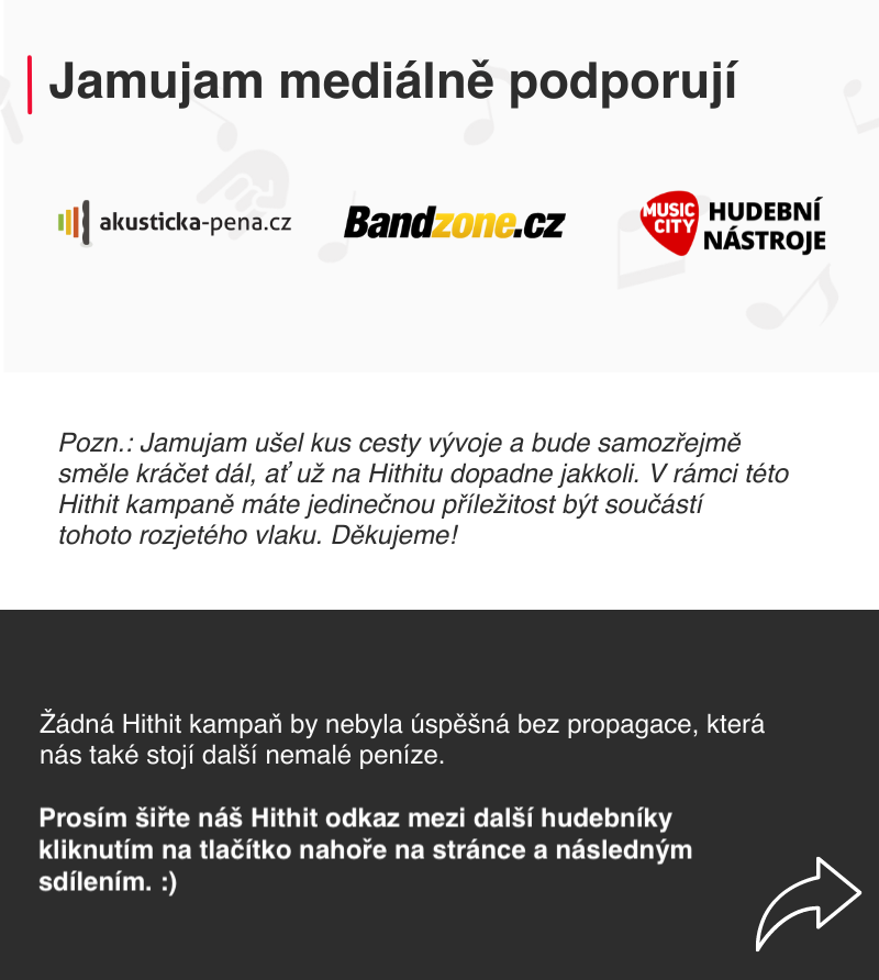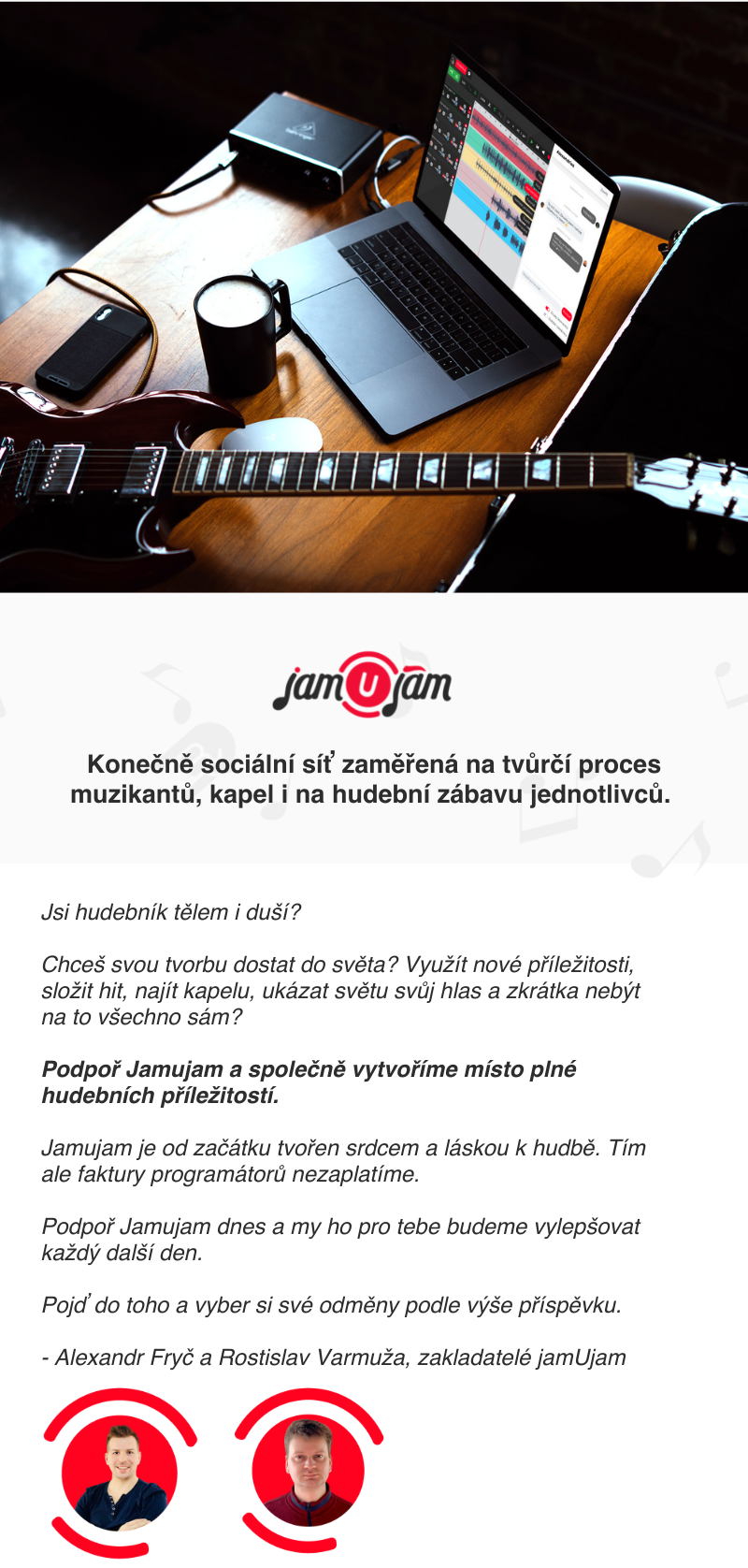 Líbí se ti, co děláme? Chceš, aby co nejdříve byla aplikace spuštěna v plné verzi také pro mobil, a abychom mohli Jamujam posouvat dál? Pak věř, že žádná stovka nepřijde nazmar! Až se někde potkáme, osobně ti poděkuji a podaruji tě třeba nálepkou či lahodným chmelovým mokem!