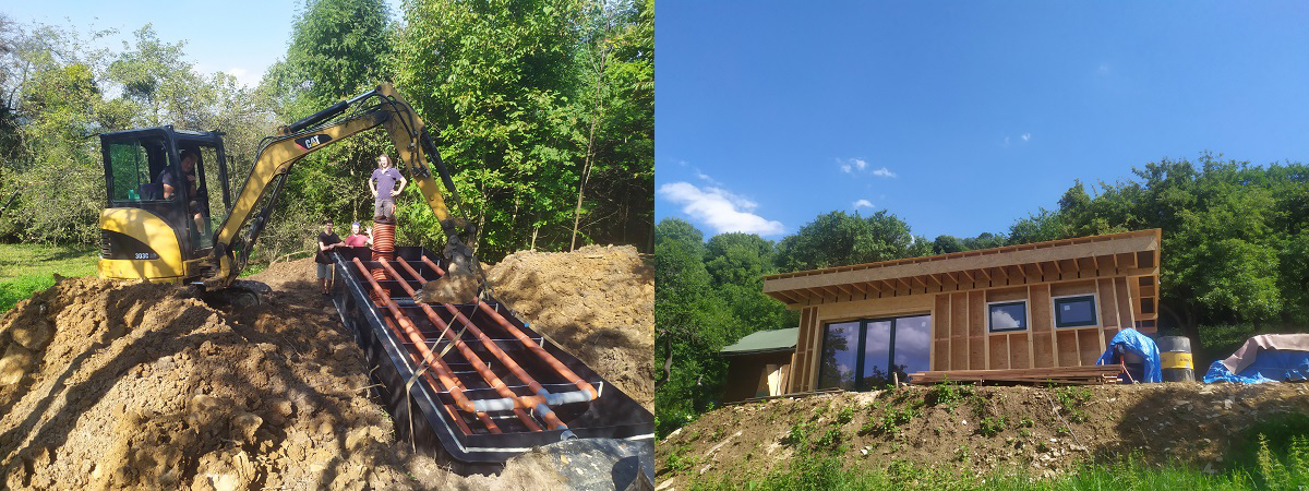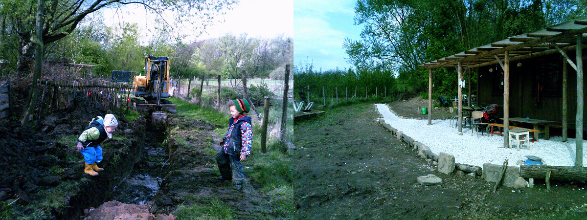 Prostředí školky bývalo zbahněné až po kolena, takže bylo potřeba, abychom vybagrovali místo pro drenáže.