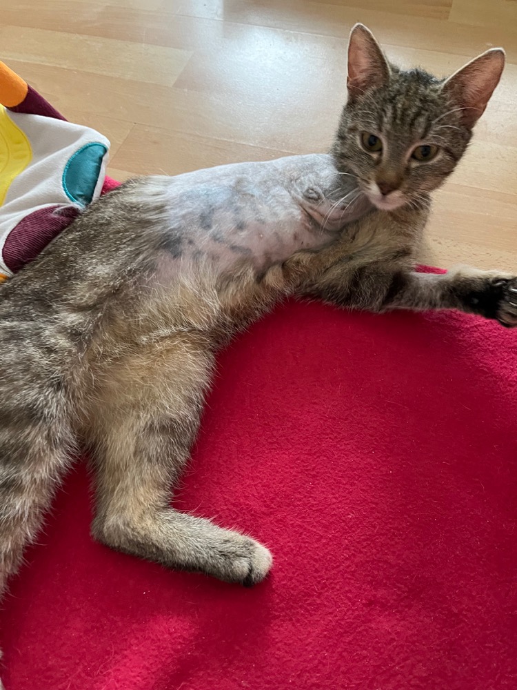 Její hospitalizace bude dosti dlouhá a stejně tak i celá následná léčba. Denní čistění ran, infuze, antibiotika, … čeká nás náročné léčení, ale na jeho konci vidíme šťastné a zdravé kotě.