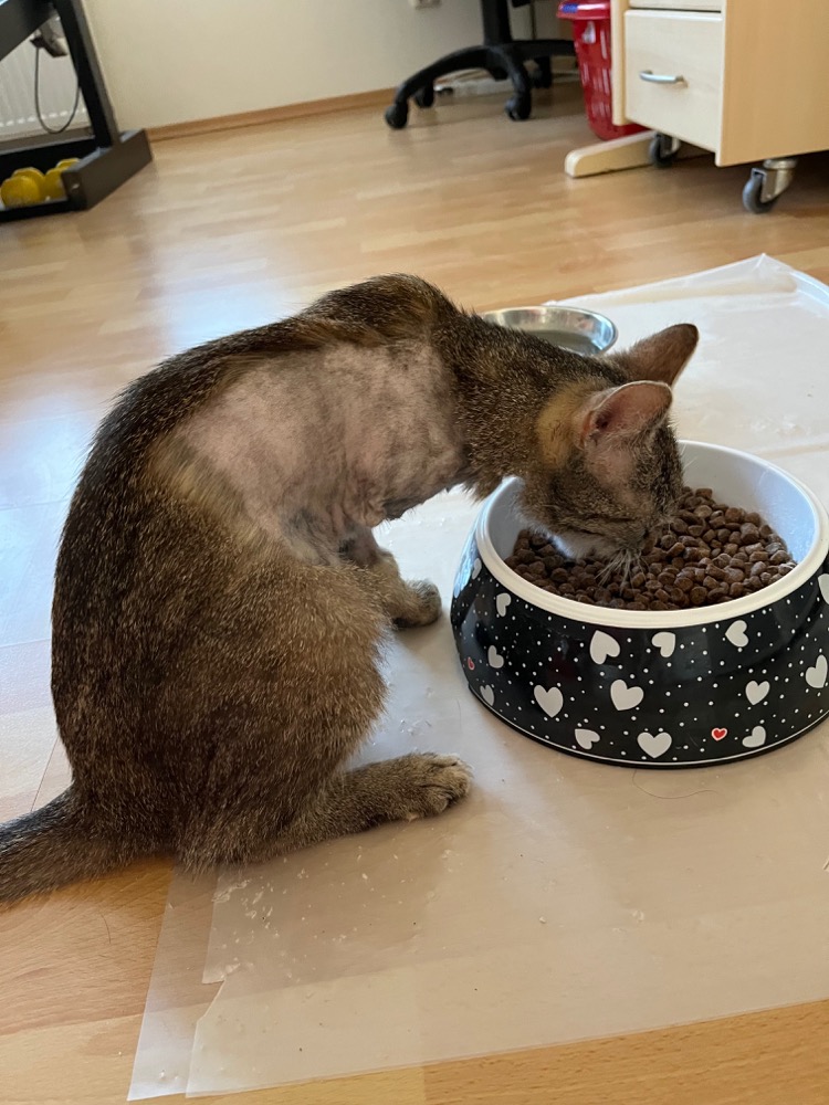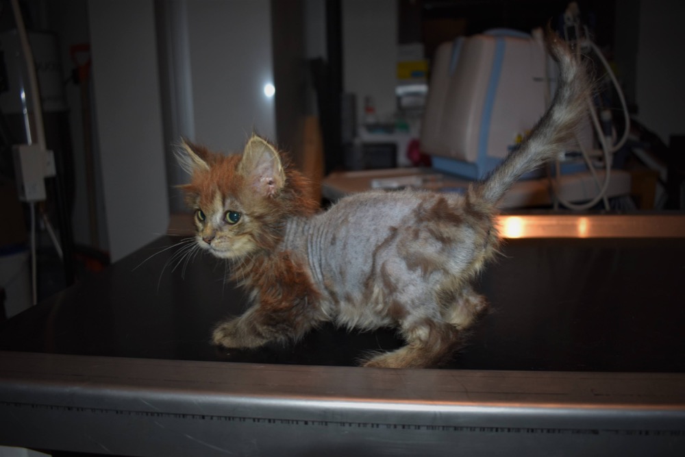 Je to asi 9-10 měsíční kotě, těžce dehydratované, zesláblé a podvyživené. Nožku má utrženou nebo ukousanou u loketního kloubu. Zranění není čerstvé. Kočička musela být chycená v pasti několik dnů a po vysvobození ještě pár dnů strádala a byla bez pomoci.