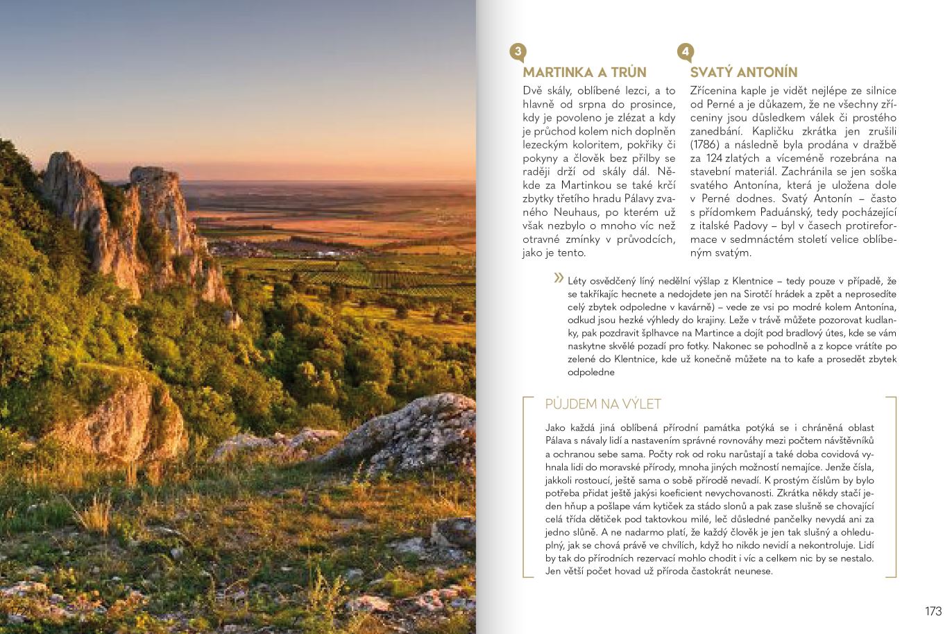 Chceme proto čtenářům přinést knížku, kde najdou nejen zajímavá místa, ale objeví i lidi, kteří tahle místa utvářeli a vdechli jim duši. Chceme také poradit, na co si dát pozor a jak se vyhnout pastem číhajícím na neznalé, a naopak navést k zážitkům, které stojí za to prožít. A možná se v ní objeví i pavouk a určitě kudlanka.