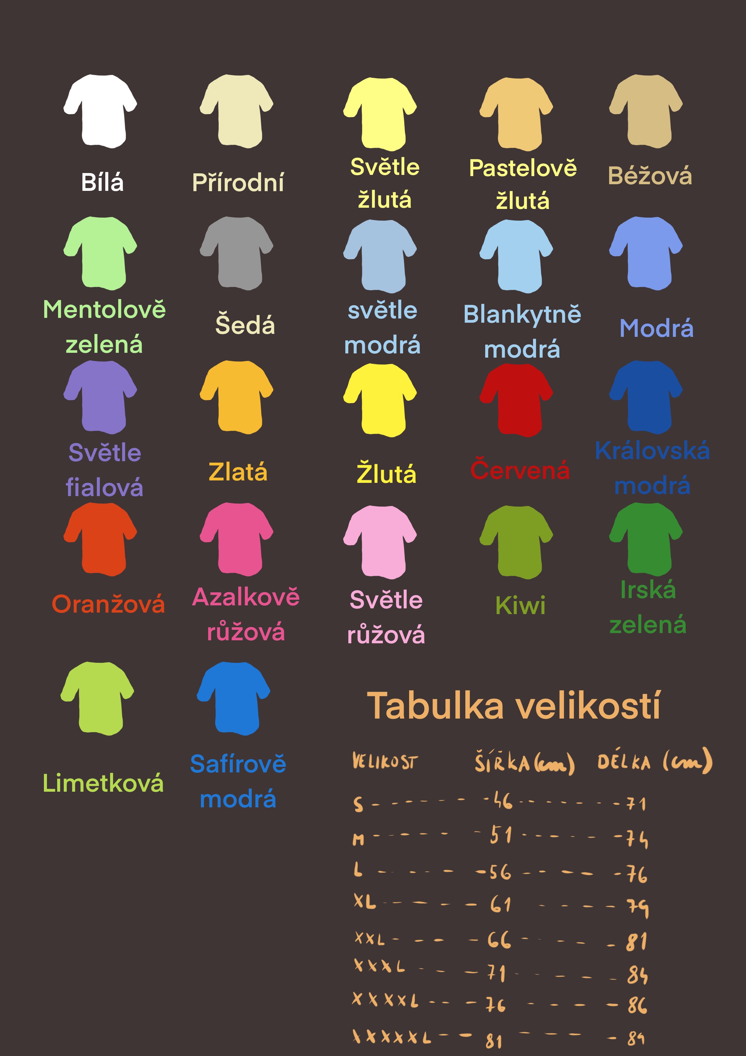 Trička jsou vyrobena z bavlny. K natisknutí designu používám vodou ředitelné barvy. Výhoda těchto barev je, že se nasáknou přímo do vláken látky a nemusíte se bát, že se vám design časem oloupe. Sice se může stát, že se design trochu vyšisuje, ale to je otázka let.