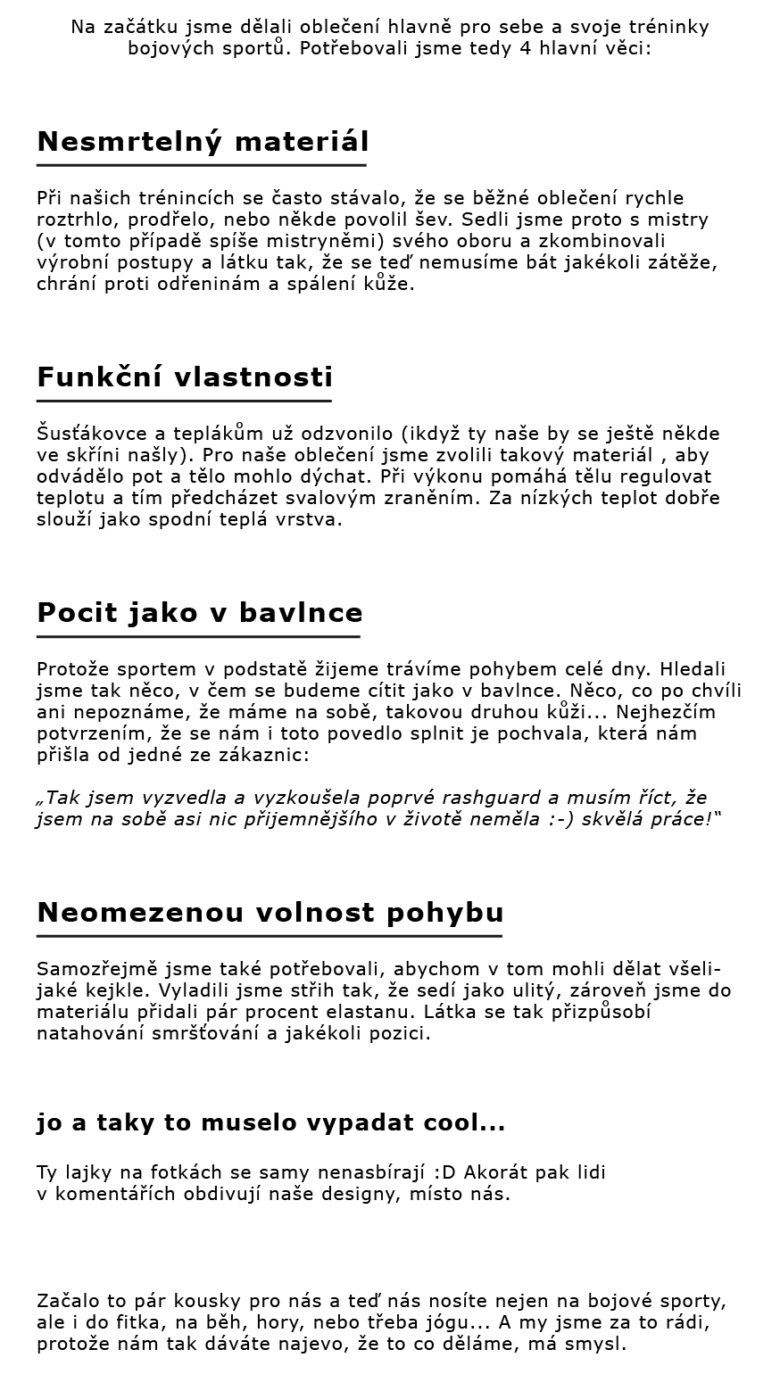 Rashguardy, legíny, kraťasy, trička, mikiny... třeba i spoďáry? Kdo ví, co postupem času vymyslíme. Můžeš se každopádně spolehnout, že z každého nového designu dostaneš 1 kousek dle tvého velikosti od každého druhu. A že jich plánujeme dost!