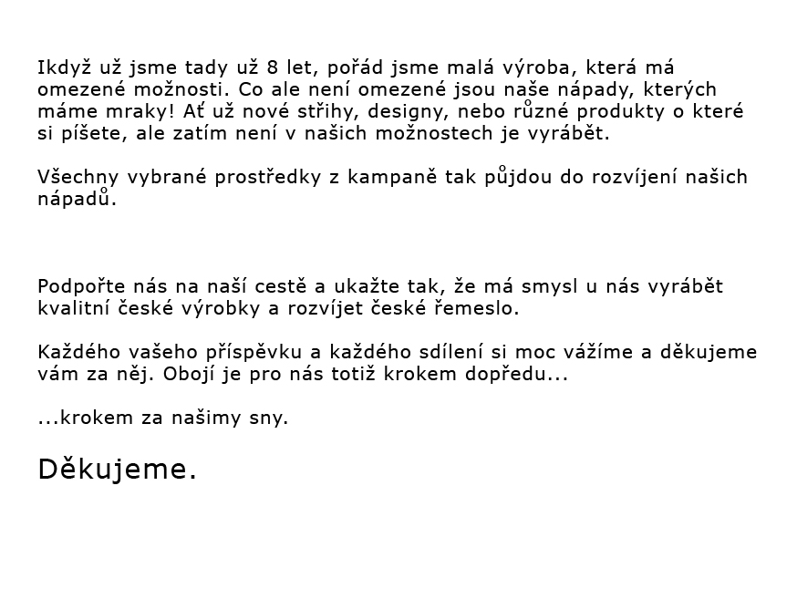 Příspěvkem podpoříte nejen nás, ale i českou výrobu a tradiční textilní řemeslo.