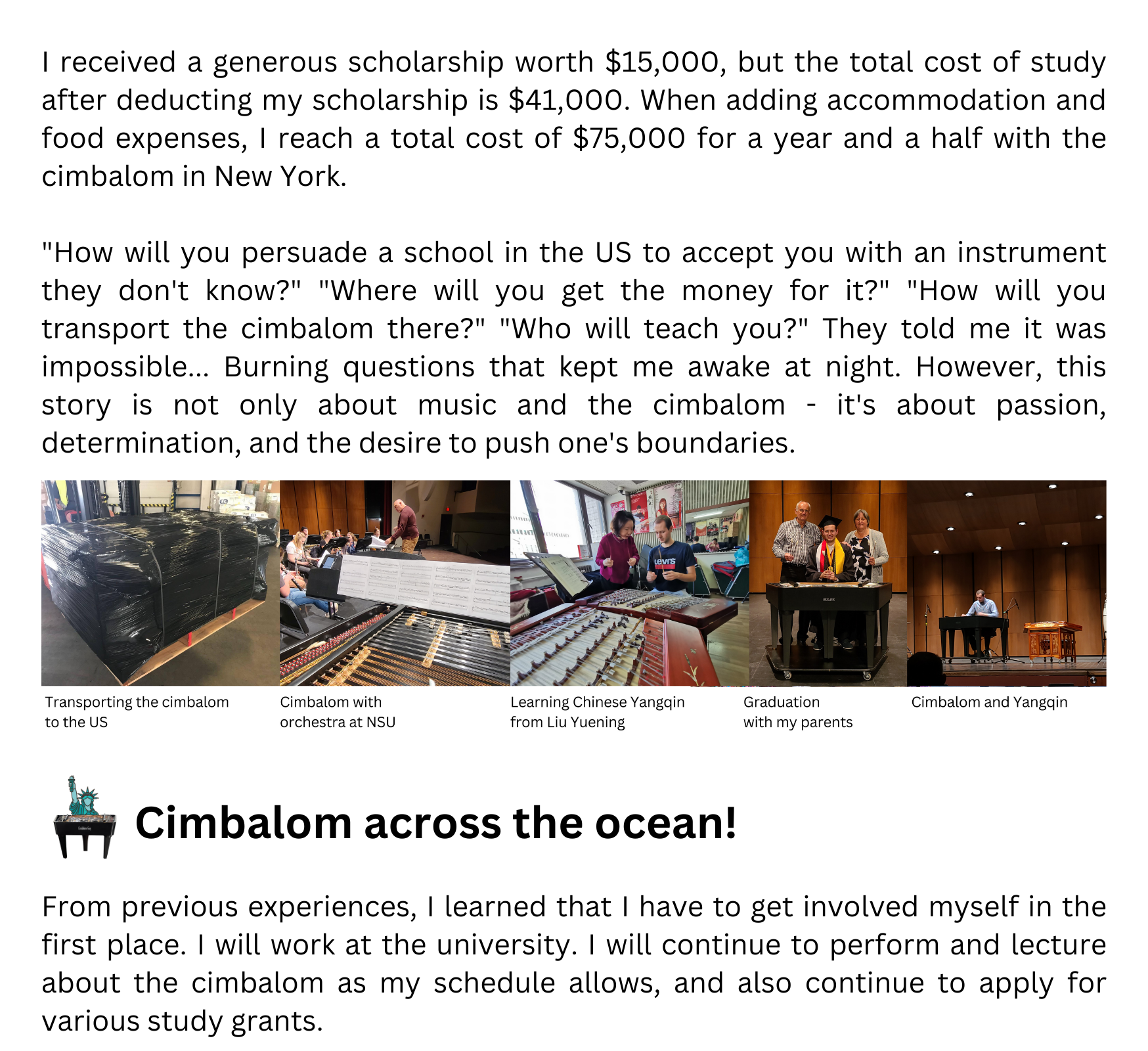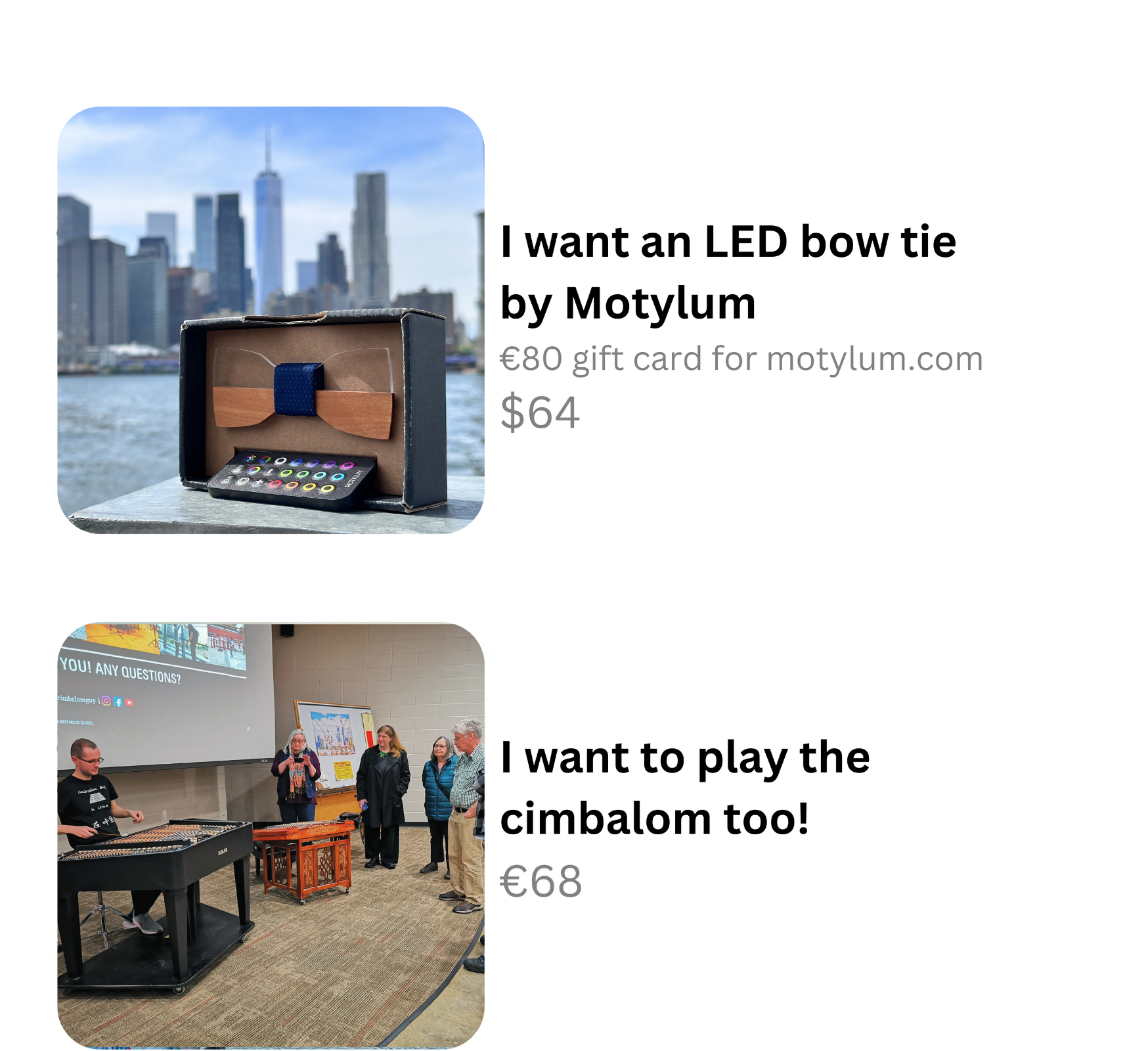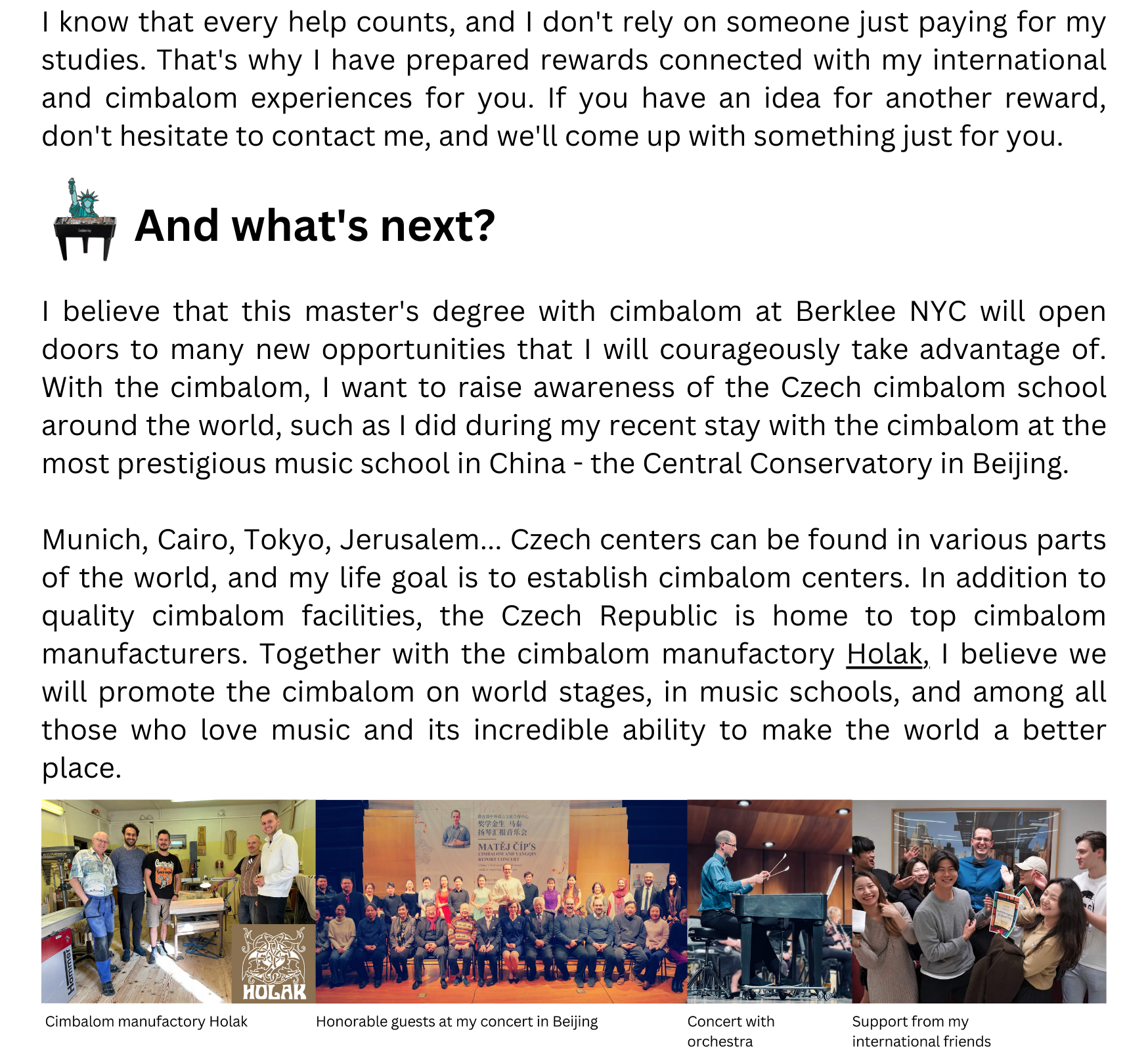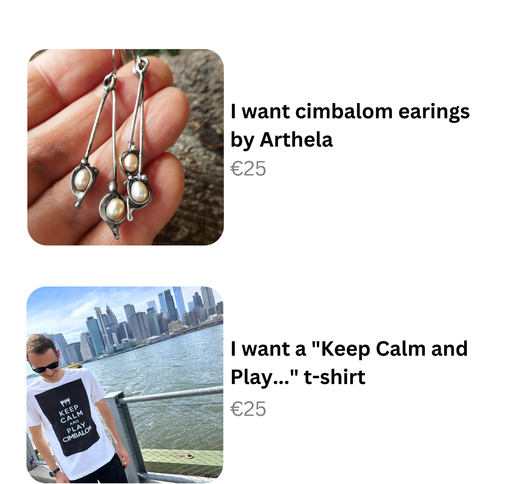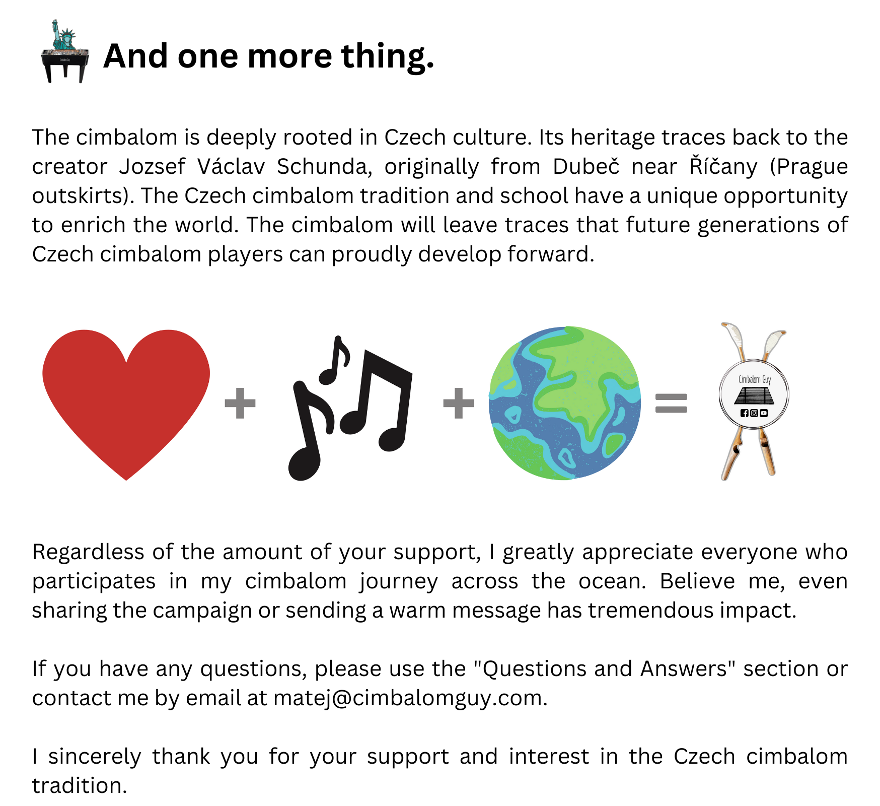 Získáním této vyjímečné ceny v kampani „S cimbálem za oceán“ se stáváš nejen podporovatelem, ale i oficiálním patronem mého hudebního dobrodružství. Tvá podpora je neocenitelná a jsem rád, že Tě mohu přivítat v této exkluzivní skupině. ?
