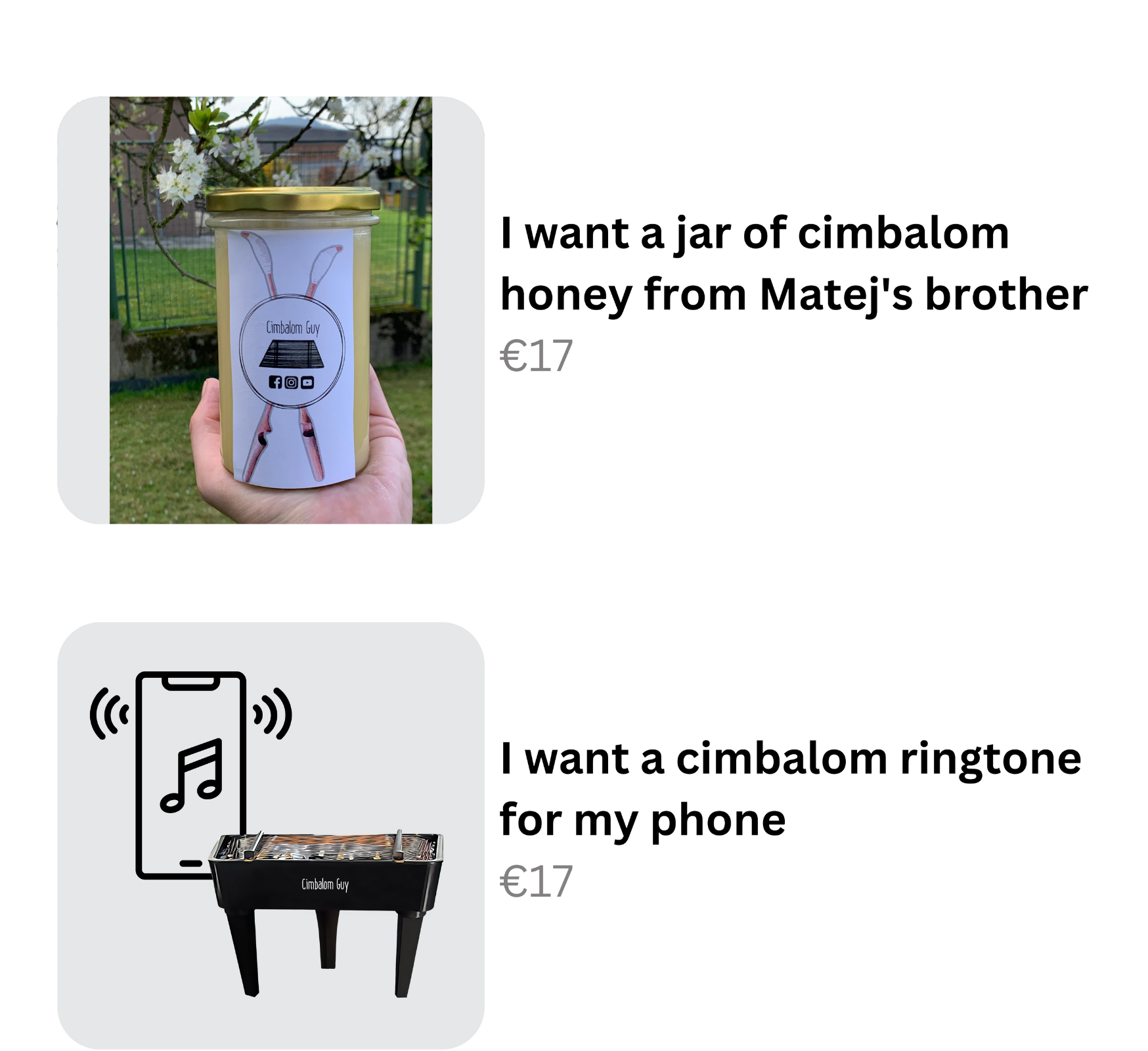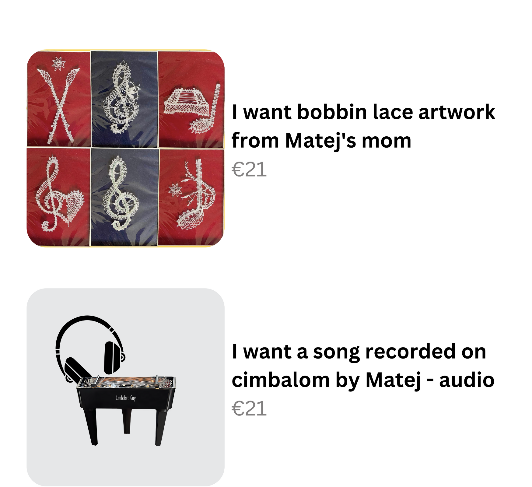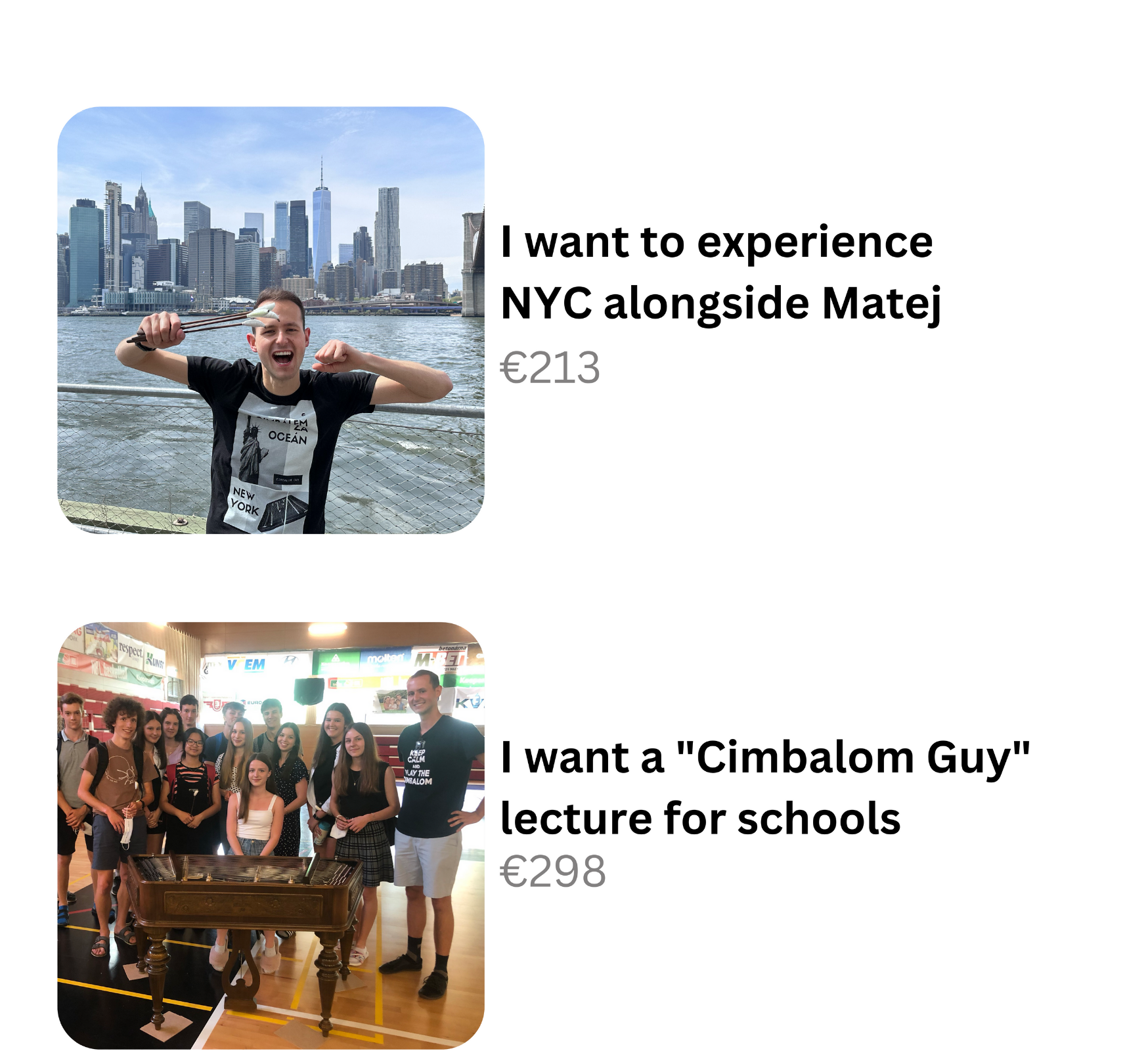Dostaneš přístup ke všem zmíněným odměnám a jako poděkování za Tvou podporu Tě budu zmiňovat všude, kde budu své cimbálové činy provádět. Tvé jméno bude spojeno s mým hudebním úspěchem a společně překročíme hranice a spojíme svět cimbálem. Tato cena zdůrazňuje, jak si vážím Tvého rozhodnutí stát se součástí mého cimbálového příběhu.