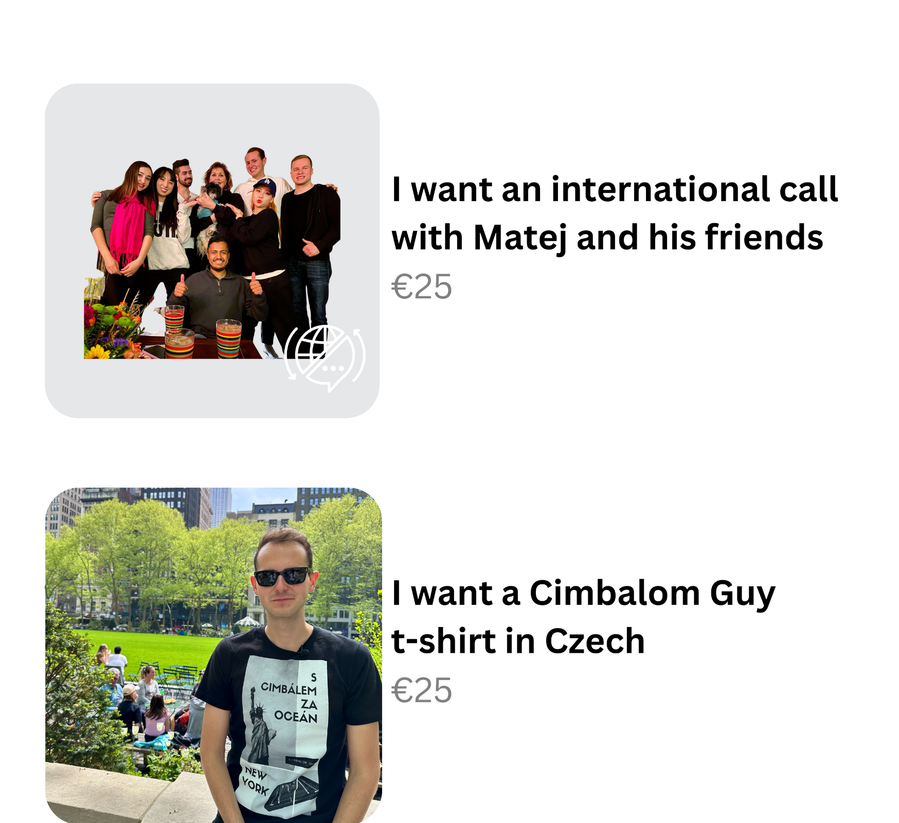 Díky mému studiu v USA jsem měl možnost poznat skvělé kamarády z různých koutů světa. Rád Tě s nimi propojím a společně probereme vše, co Tě bude zajímat. Tato odměna Ti přinese nejen nové přátele, ale také otevře dveře k lepšímu pochopení různých kultur a životních stylů.