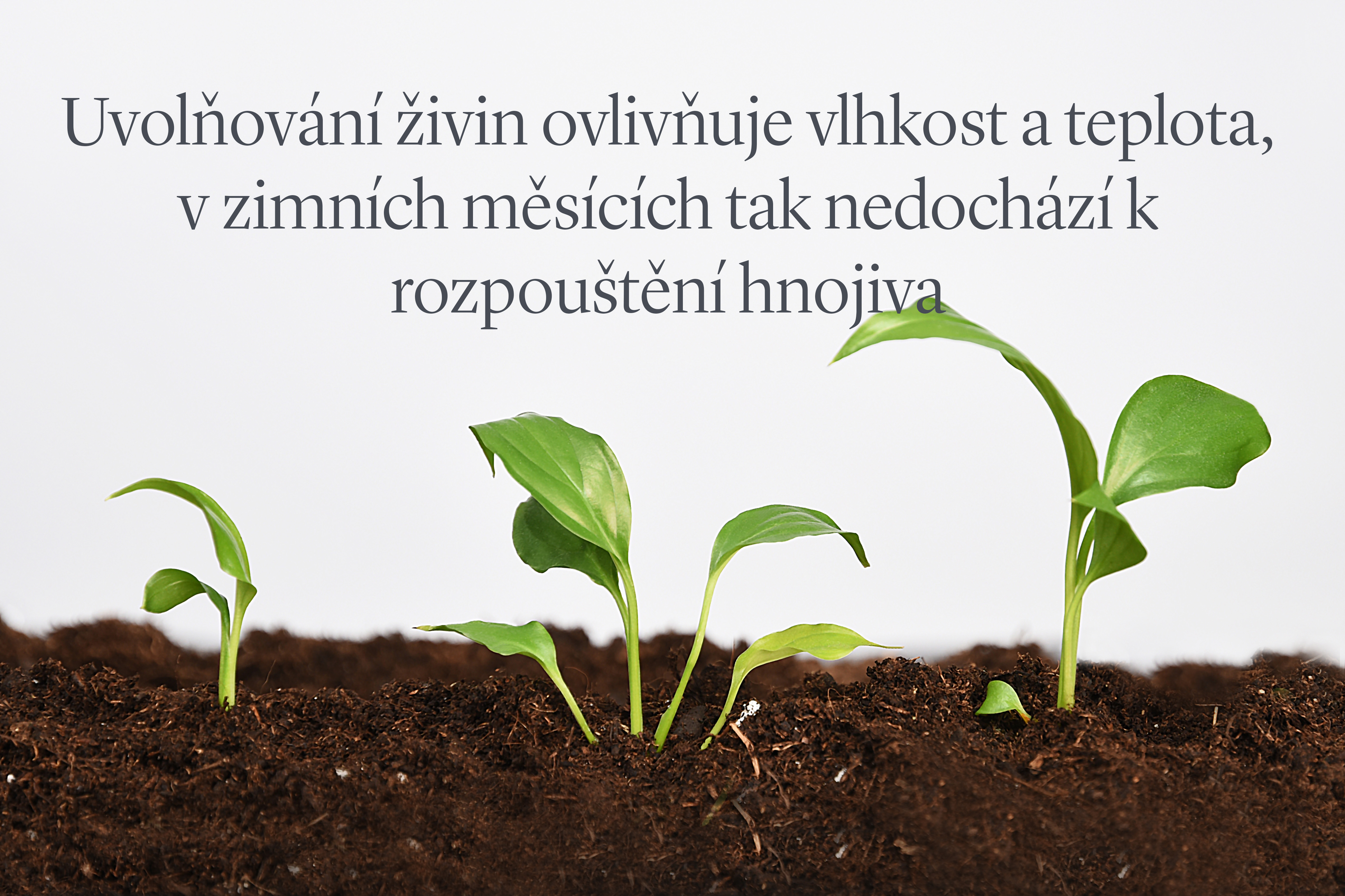 Řízené uvolňování je podmíněno vlhkostí a teplotou (běžné půdní podmínky v období březen - listopad). V době vegetačního klidu tedy nedochází k uvolňování výživových látek, což patří mezi důležité a pozitivní vlastnosti.