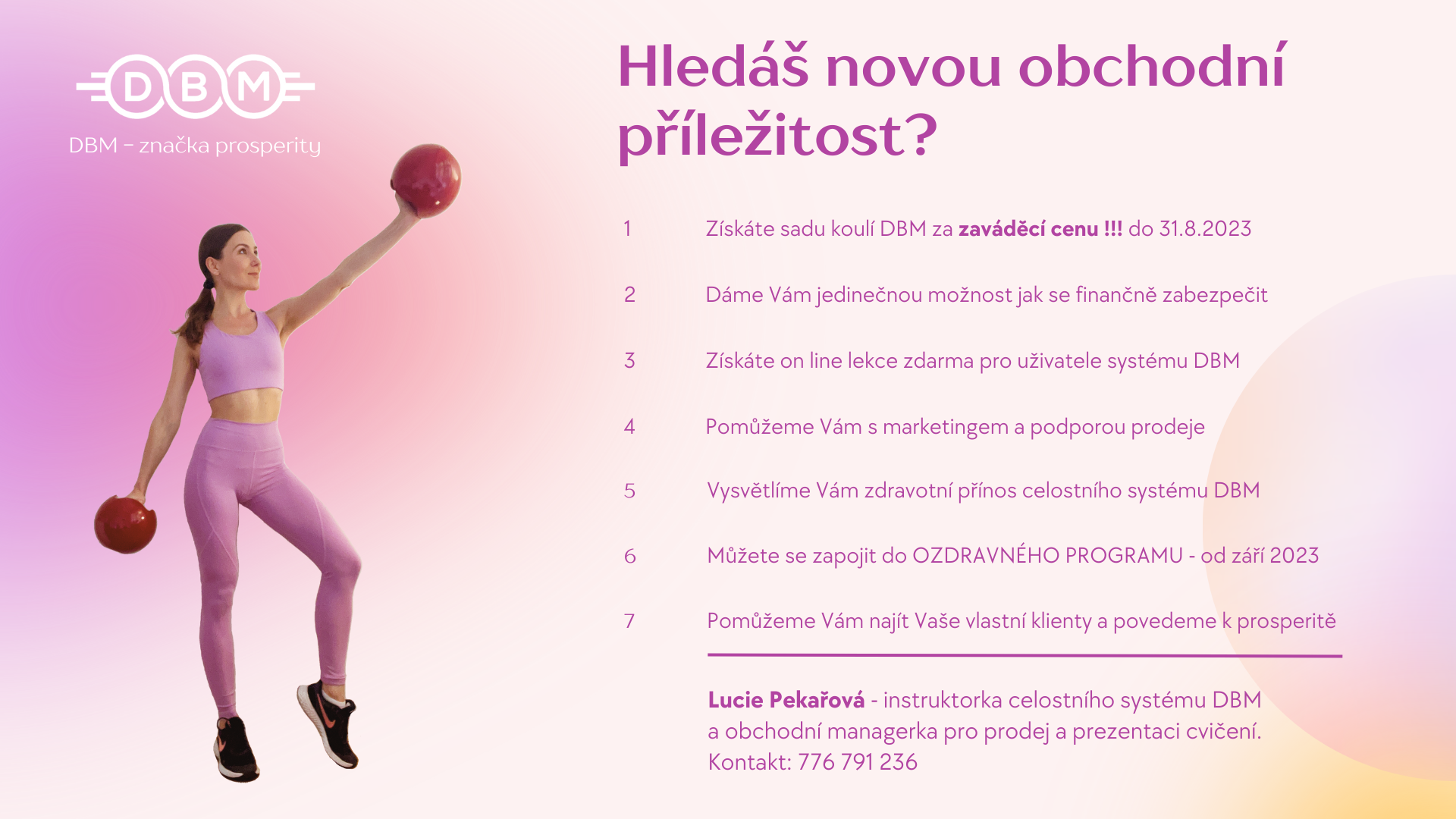 Dáváme možnosti se zapojit do obchodní spolupráce v budování center zdraví DBM a umožnit provozovat systém cvičení pro klientelu, která si hledá nové způsoby pohybu. Vytváříme příležitosti pro zdravý a prosperující život.